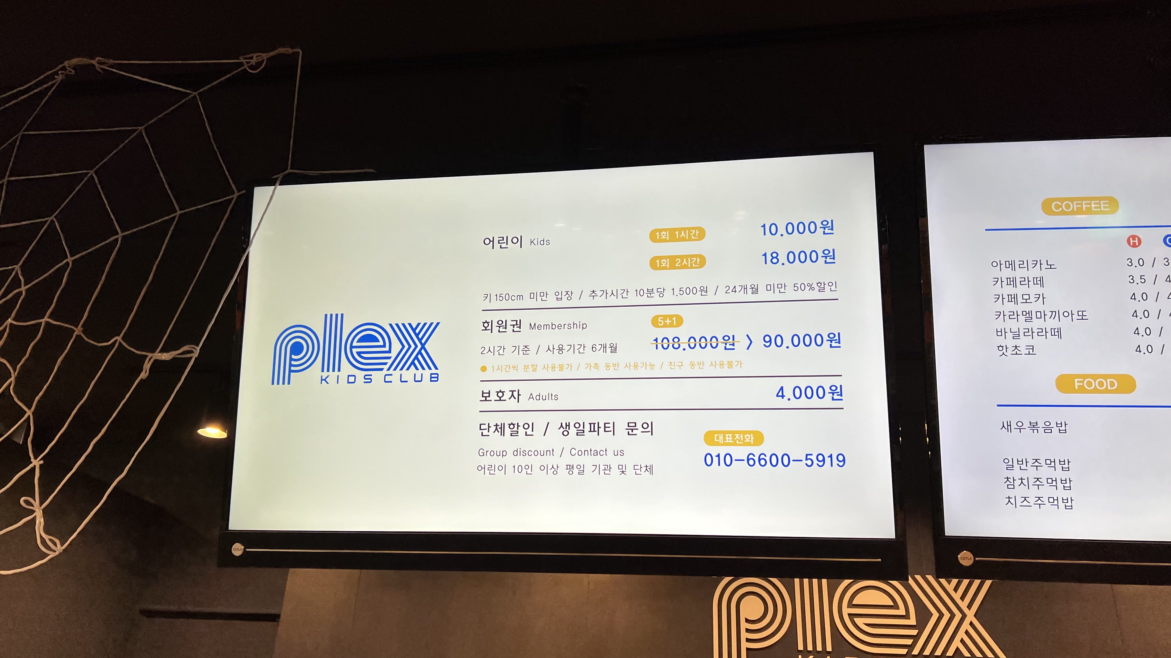 참고로 플렉스 키즈클럽은 키 150cm 미만만 입장이 가능하다. 멀리 왔으니 당연히 2시간은 놀아야지! 우리는 1회 2시간 2명과 보호자 1명까지 총 40,000원을 결제했다. 일단 입장료는 선불로 내고, 퇴장하면서 추가시간을 정산하면 된다.