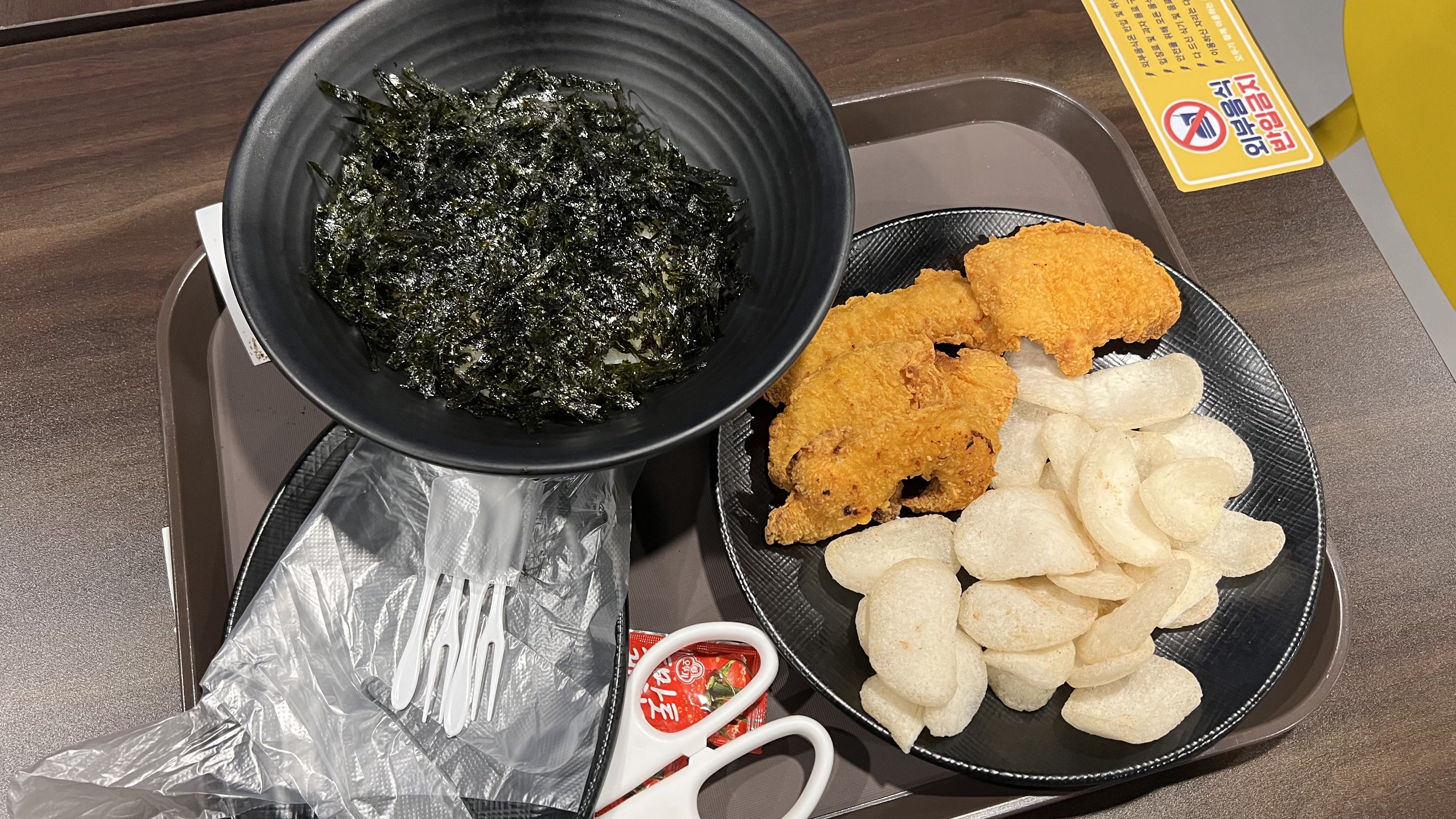 우리는 피아노 콩쿨을 마치고 바로 키즈카페로 이동했기 때문에 점심식사를 하지 못했다. 배가 고픈 상태여서 곧바로 음식부터 주문해서 일단 식사를 하기로 했다. 일반주먹밥, 치킨텐더&칩스를 주문했다. 역시 음식 주문도 선불이다. (여긴 다 그때그때 결제!)