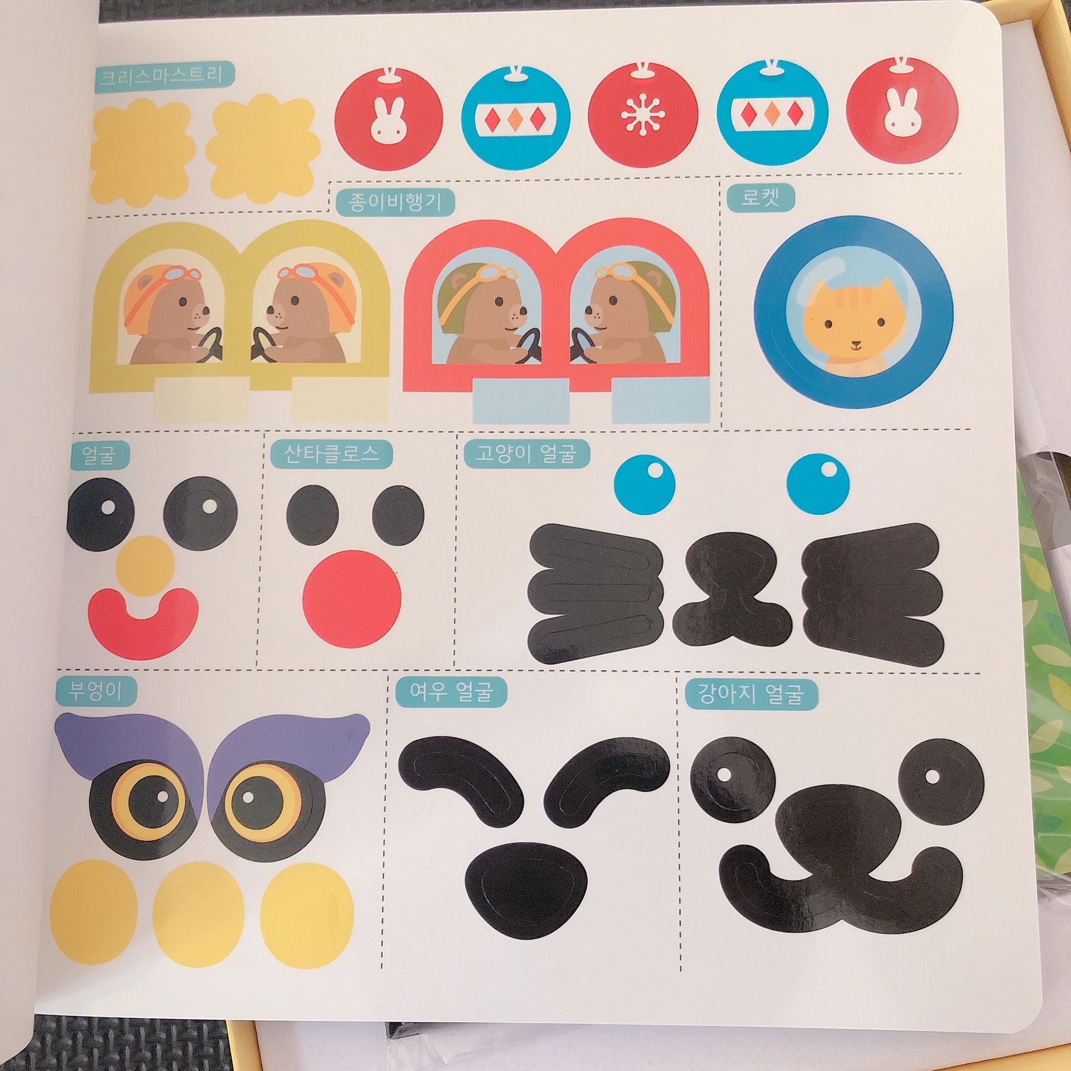 앞쪽에 색종이에 붙여서 꾸밀 수 있는 스티커가 두 장 들어있다. 버스나 집, 종이비행기, 로켓 등에 붙일 수 있는 귀여운 창문 스티커와 돼지코, 부엉이 얼굴, 여우 얼굴, 강아지 얼굴 등에 맞춰진 스티커 들도 있다. 아니, 이런 미친 구성! 종이접기 퀄리티가 이렇게 높을 수 있다니!