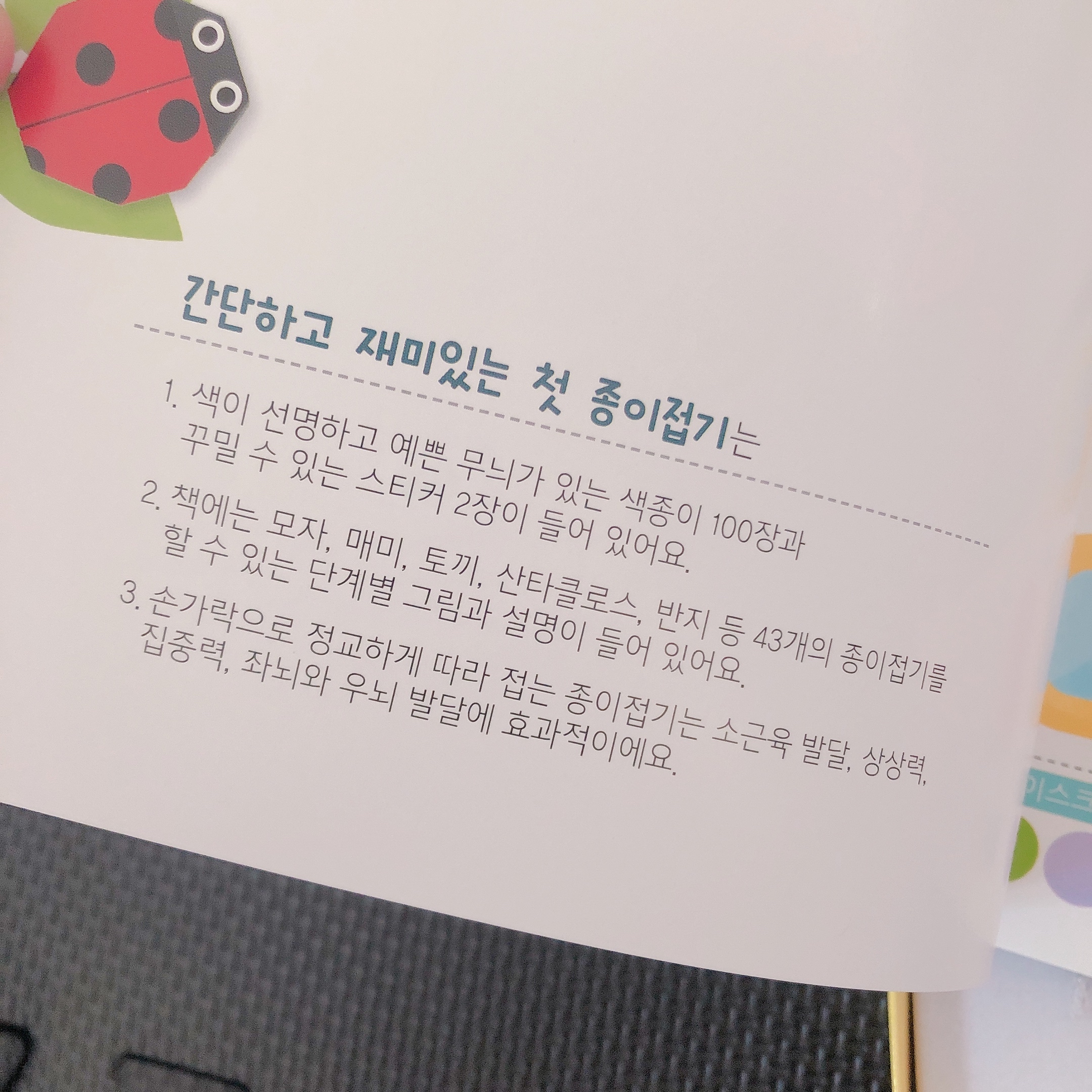 알록달록 귀여운 박스를 열면 종이접기 도서가 들어있다. 유아 도서라서 위험하지 않도록 모서리 부분이 라운딩 처리되어 있는 것이 마음에 든다.