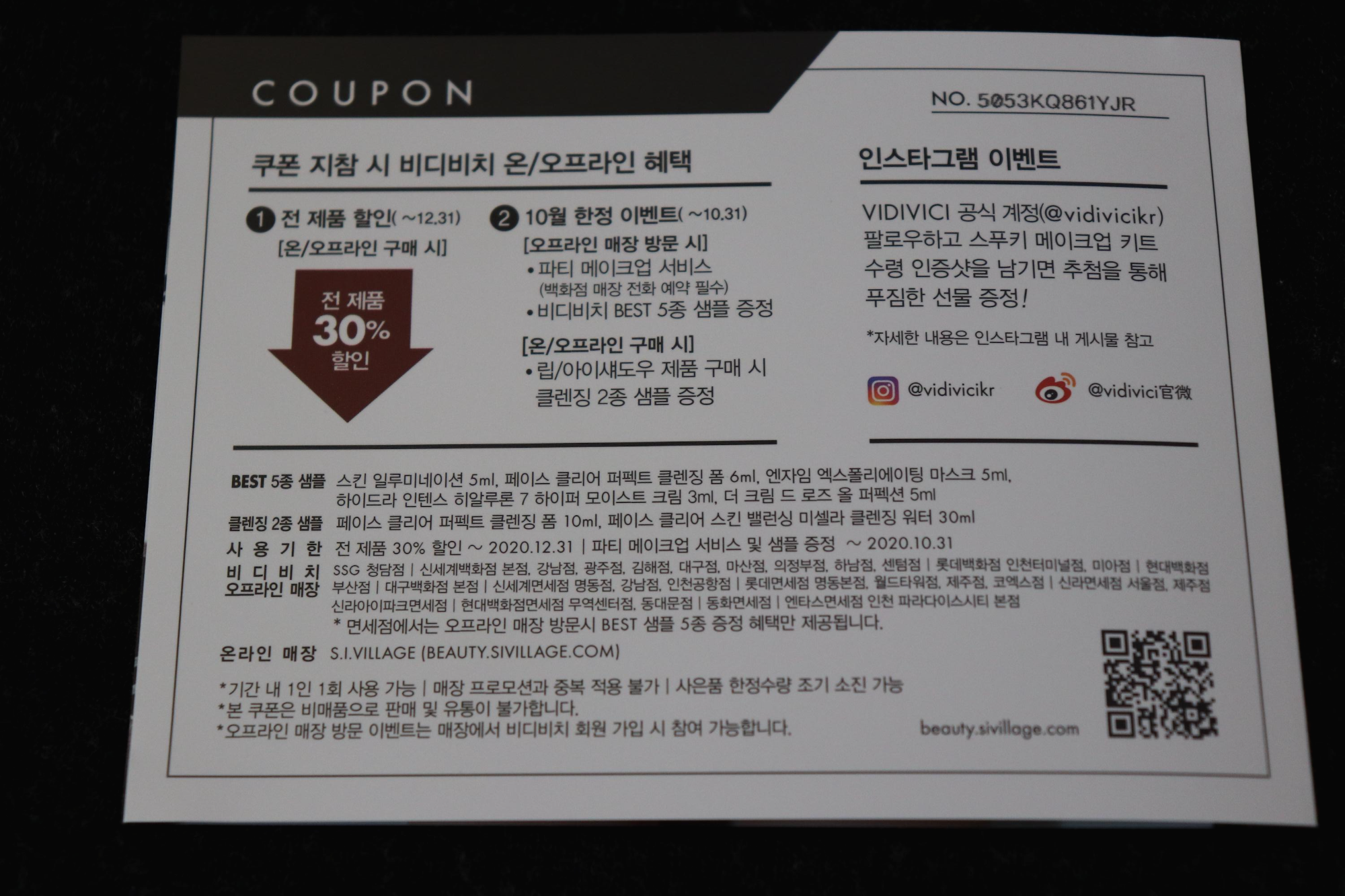 비디비치 제품을 30% 할인받을 수 있는 쿠폰이 함께 들어있다. 오프라인 매장에 방문하면 비디비치 best 5종 샘플을 받을 수 있고, 온/오프라인으로 립, 아이섀도우 제품을 구매하면 클렌징 2종 샘플을 증정한다고 한다. 쿠폰은 2020년 12월 31일까지 사용할 수 있다. 아직은 부족한 게 없지만 혹시 모르니 이건 일단 보관하는 걸로ㅋㅋㅋ
