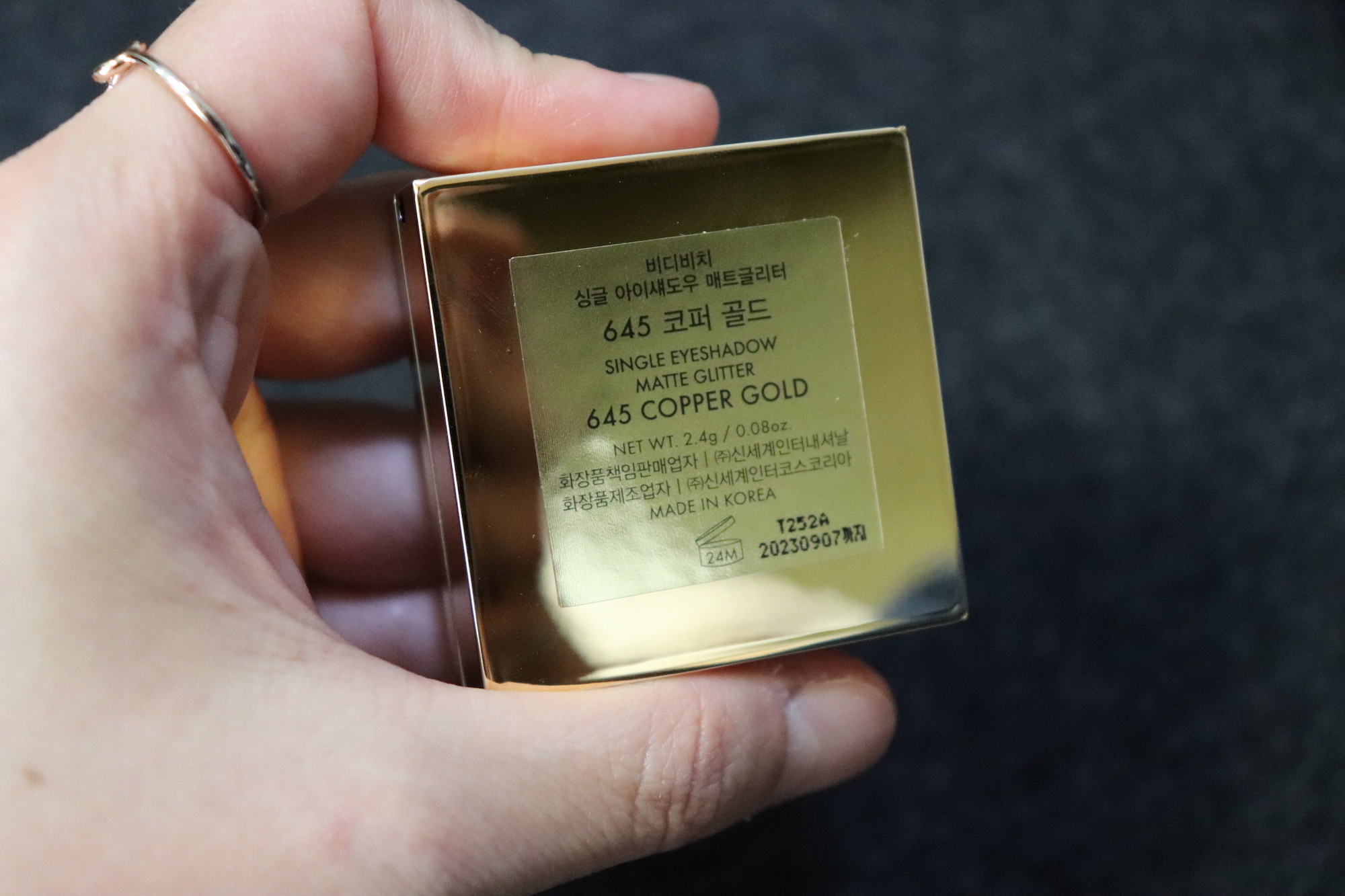 비디비치 싱글 아이섀도우 매트글리터는 645 코터골드 색상으로 할로윈 메이크업 뿐만 아니라 평소에도 무난하게 사용할 수 있는 색상인 것 같다. 용량은 2.4g 아담하고 가벼운 사이즈이다. 용기 겉은 지문이 너무 빨리 묻어서 좀 부담스럽다. 사진을 찍어야 하니 조심 조심~