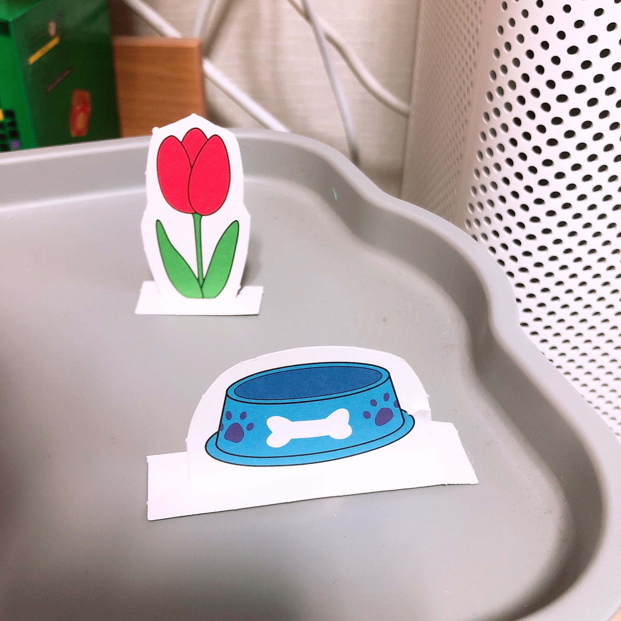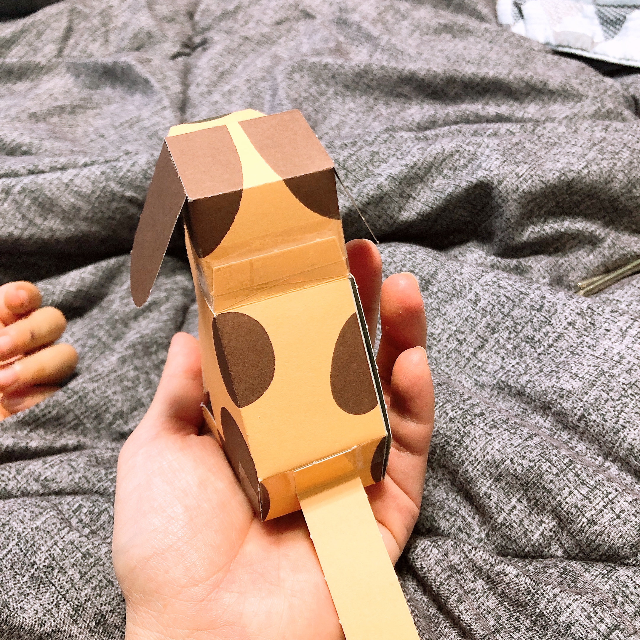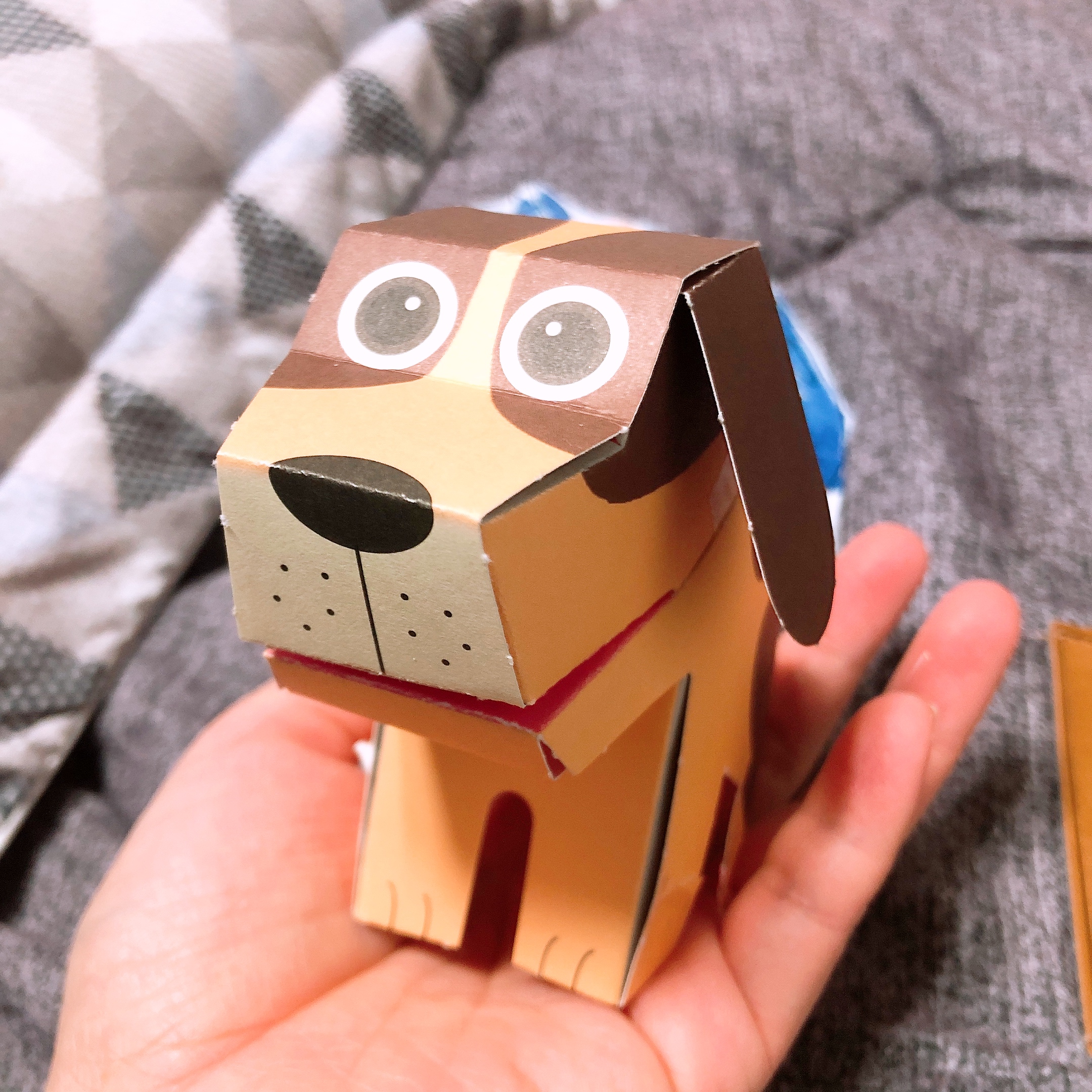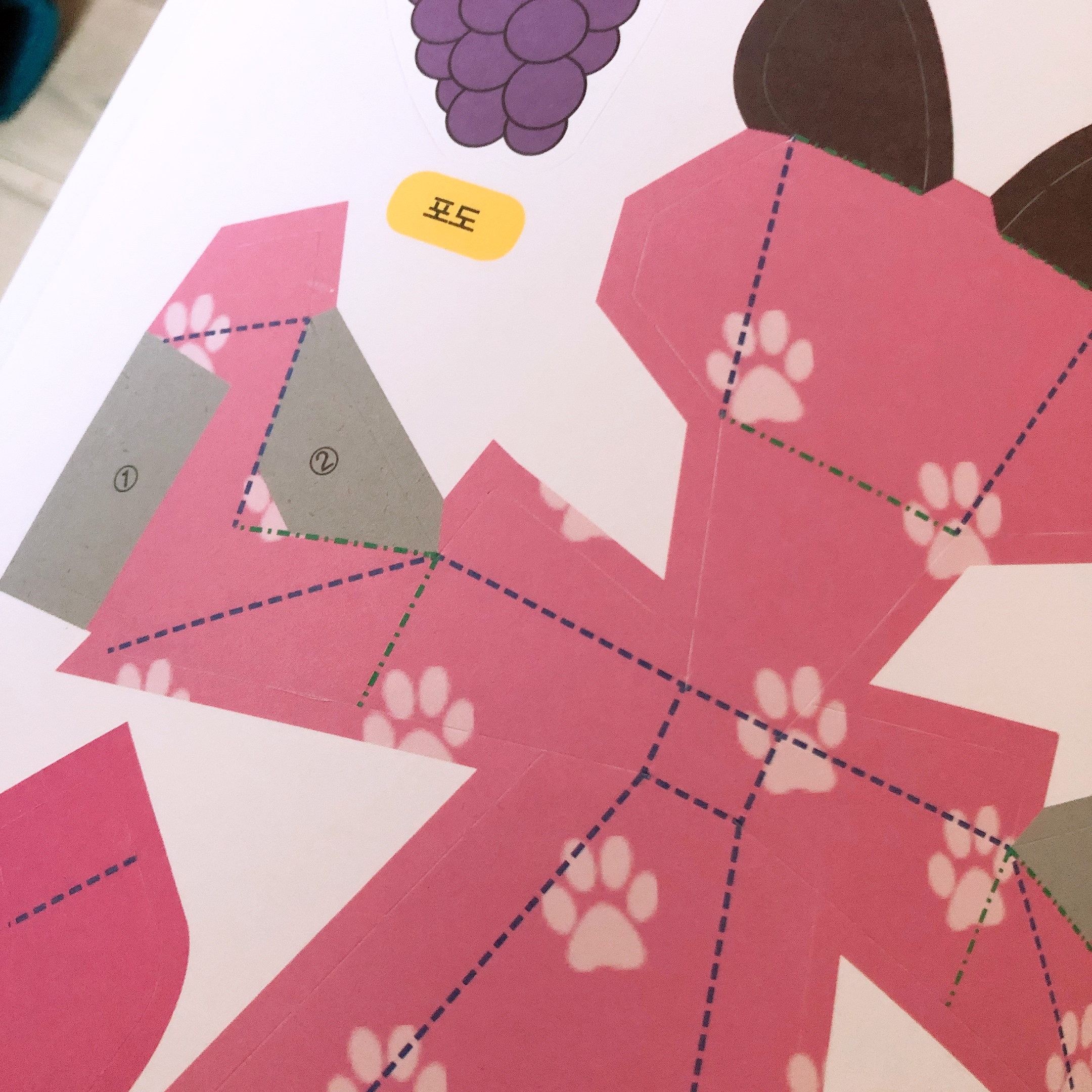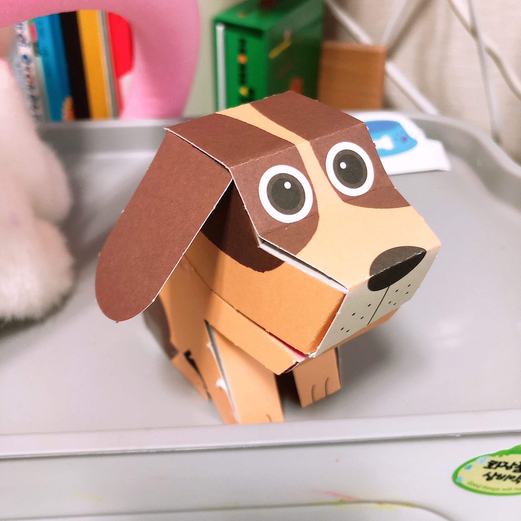 점선 따라 접고 풀칠해서 강아지를 뚝딱 완성했다. 딱풀을 사용했는데 아무래도 부착력도 만족스럽지 않고, 붙을 때까지 기다리는 시간이 지루해서 스카치 테이프를 사용했다. 풀을 사용할 때보다 훨씬 내구성이 높아져서 가지고 다니면서 역할 놀이를 해도 강아지가 구겨지거나 모양이 눌리지 않게 되었다. (스카치 테이프 사용 강추!)