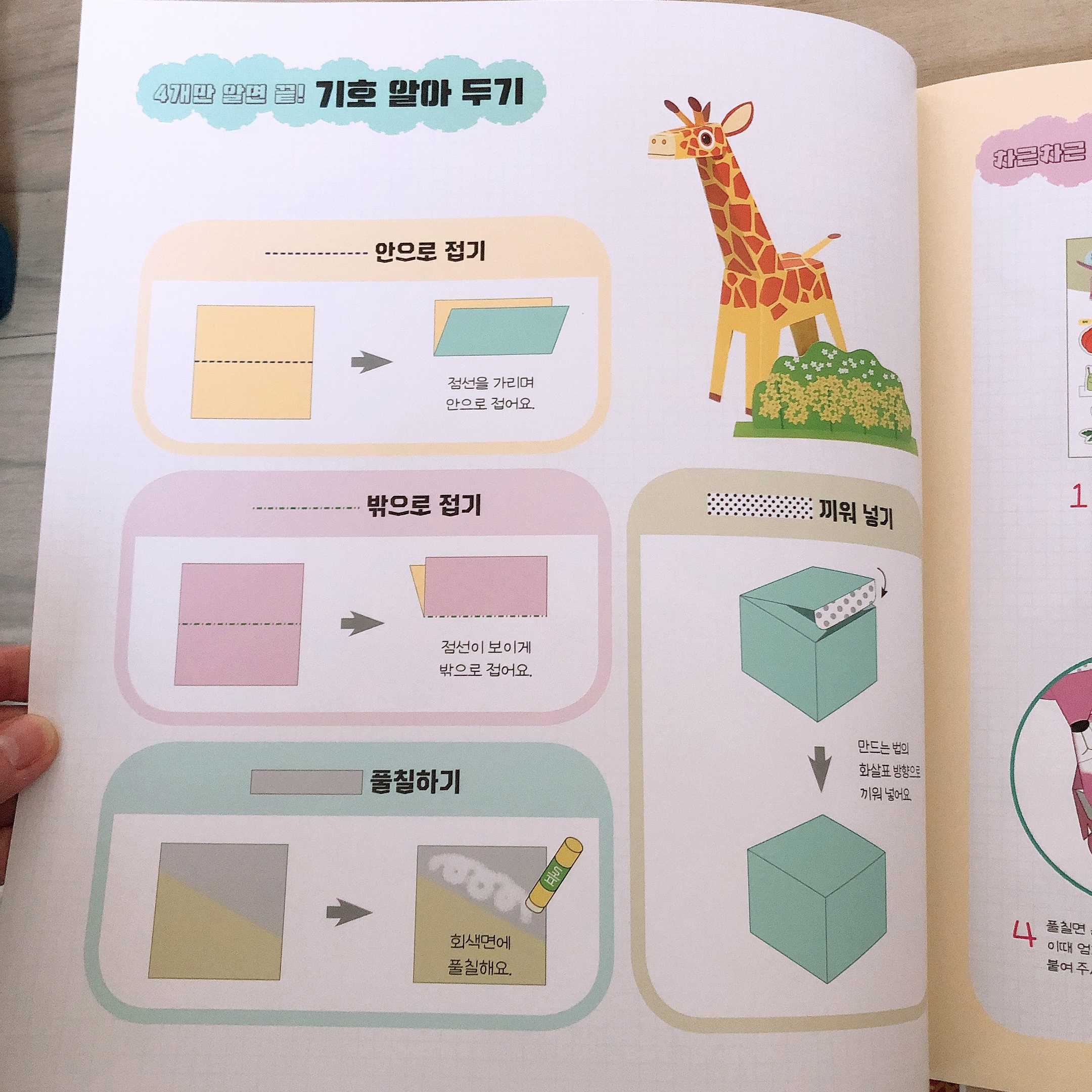 도서 첫 페이지를 넘기면 간단한 종이접기 기호와 만드는 방법이 안내되어 있다. 안으로 접는 선, 밖으로 접는 선, 풀칠하는 곳, 끼워넣는 곳이 각각 다른 색상과 패턴으로 인쇄되었다. 만드는 방법도 정말 간단하다. 완성된 동물의 모습을 확인한 후에 도안을 뜯어내고 접기선에 따라 접은 후 풀칠해서 붙여주면 완성이다.