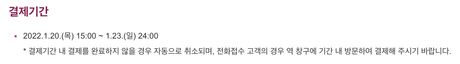 예약을 하고 나서 결제를 하려는데 응? 결제가 안된다고? 카카오페이를 써도, 신용카드를 써도, 결제가 되지 않았다. 설 명절 SRT 티켓 결제 오류인가? 뭐지? 인간적으로 이건 오류나면 안 되는거지!!! (멘붕ㅜㅜ) 이상해서 관련 공지사항을 다시 확인해보니 설 명절 SRT 티켓 예매는 사람들이 많이 몰리는 관계로 예약 기간과 결제 기간을 분리하여 운영하고 있었다.