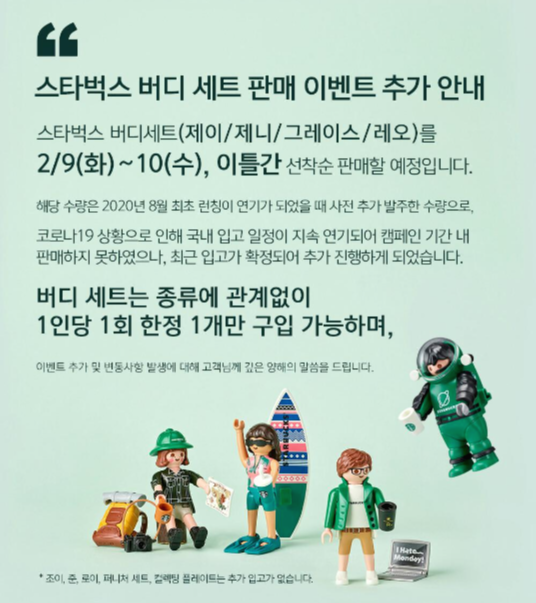 스타벅스 버디세트 '회사원 제이'와 '하이커 제니'를 너무 갖고 싶었는데, 리셀러들로 인해 중고시장에서 금액이 너무 높게 책정되어 나는 도저히 그 금액으로 구매할 수가 없었다. 그래서 아쉬워하던 중 스타벅스 앱에 기적과도 같은(!) 공지가 올라왔다.