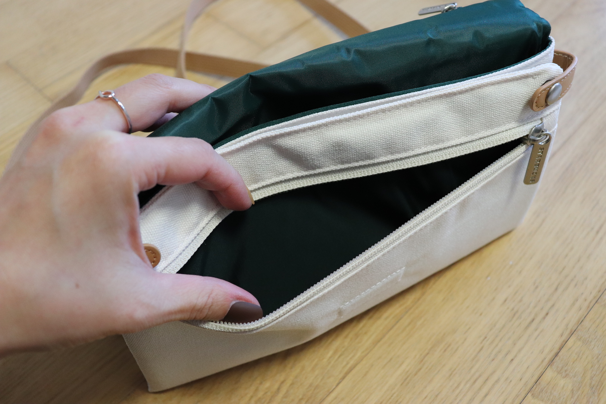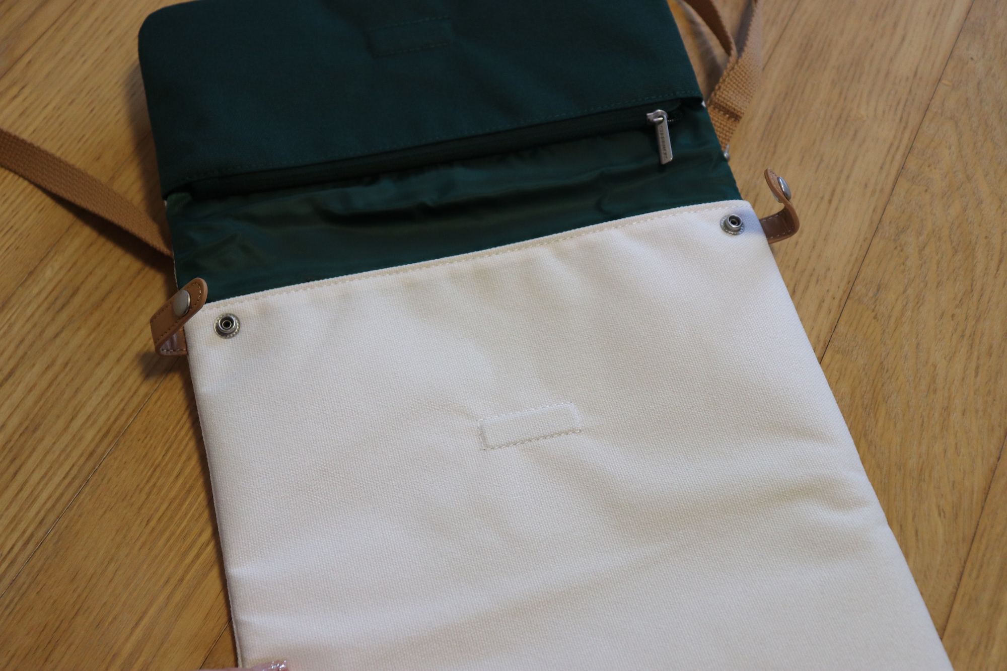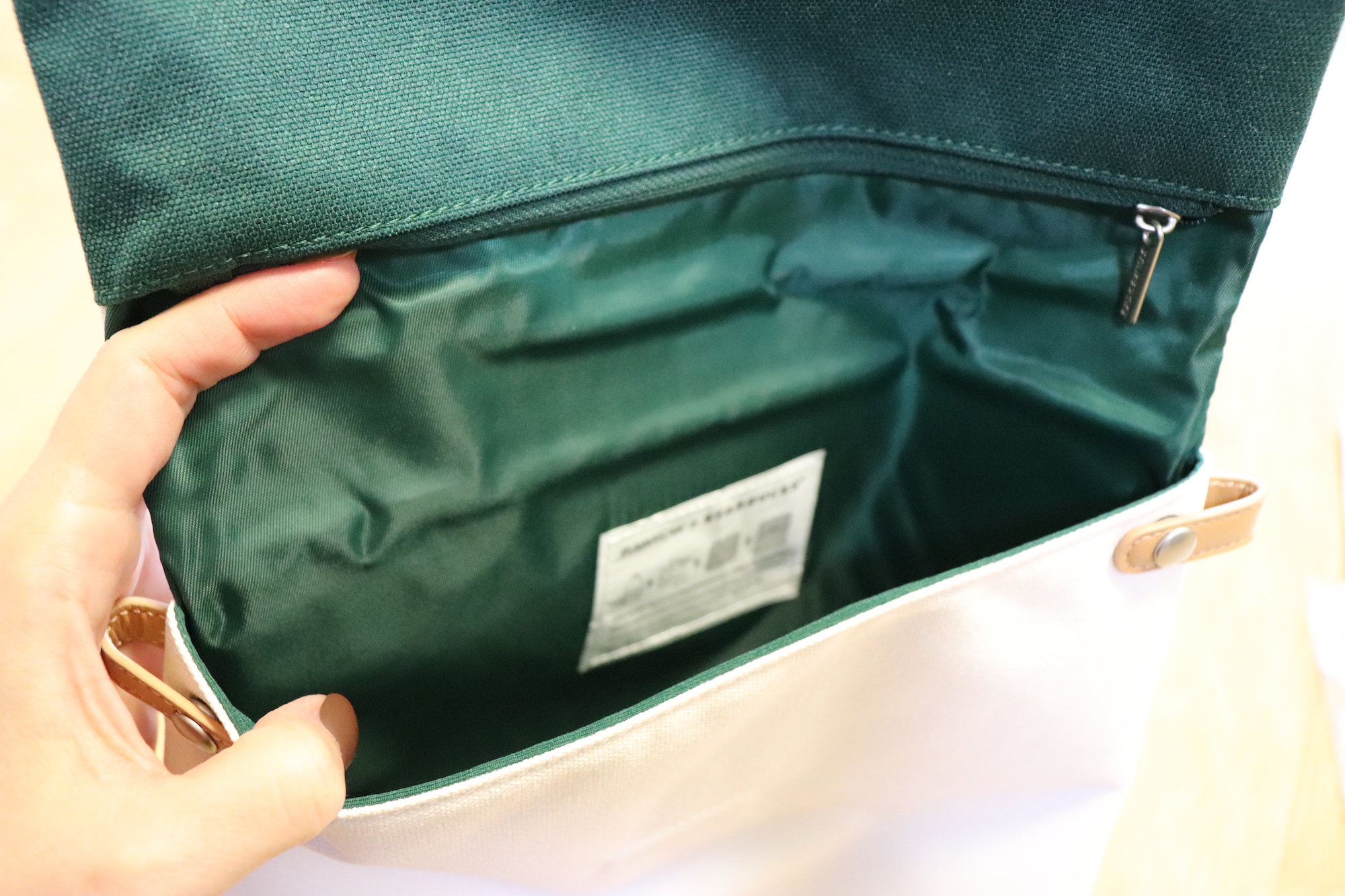 크로스백을 열면 윗부분에 지퍼가 있어 작은 소품들을 수납할 수 있다. 크림 색상의 겉감과 그린 색상의 안감, 그리고 브라운 색상의 스트랩까지 너무 마음에 드는 조합이다.