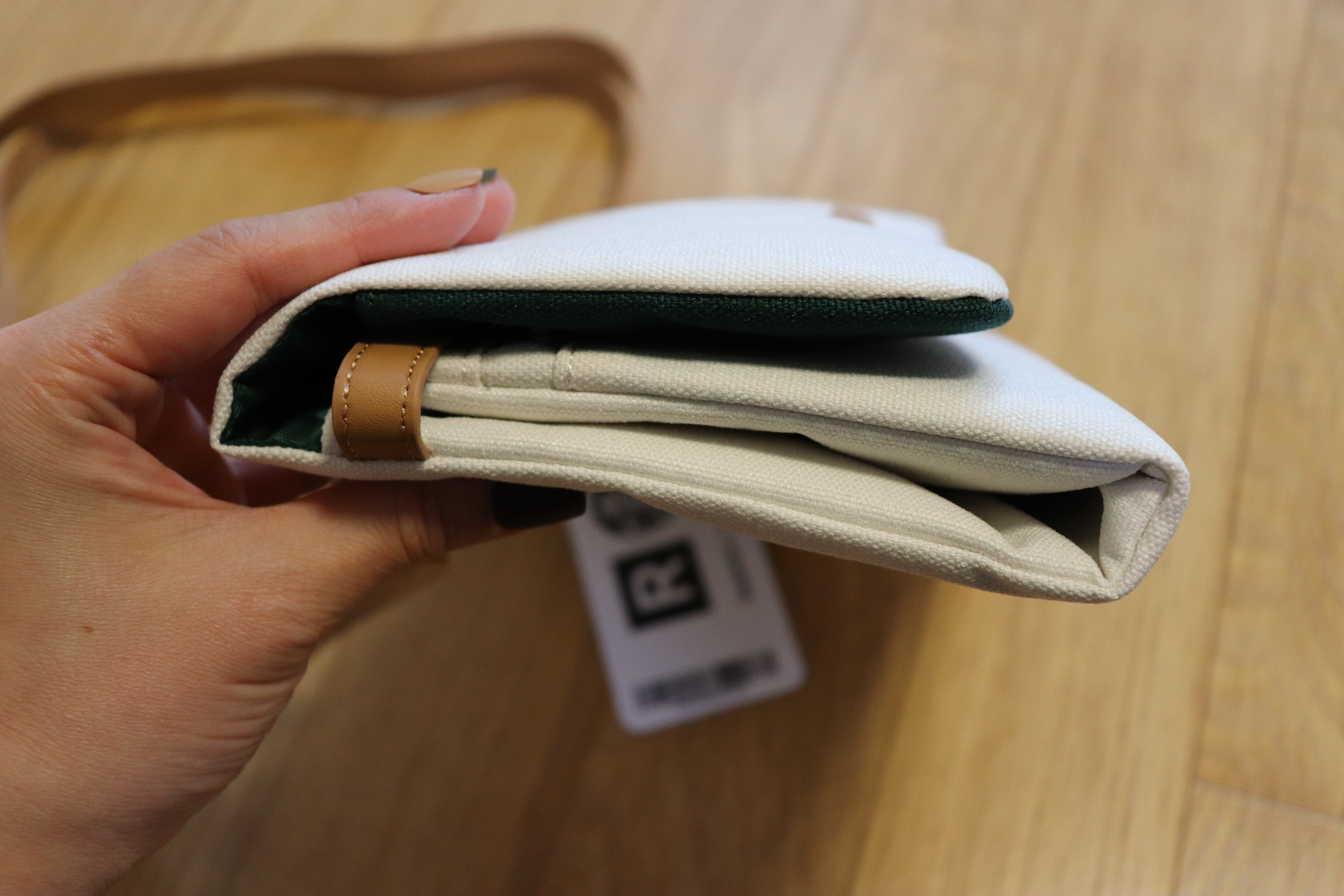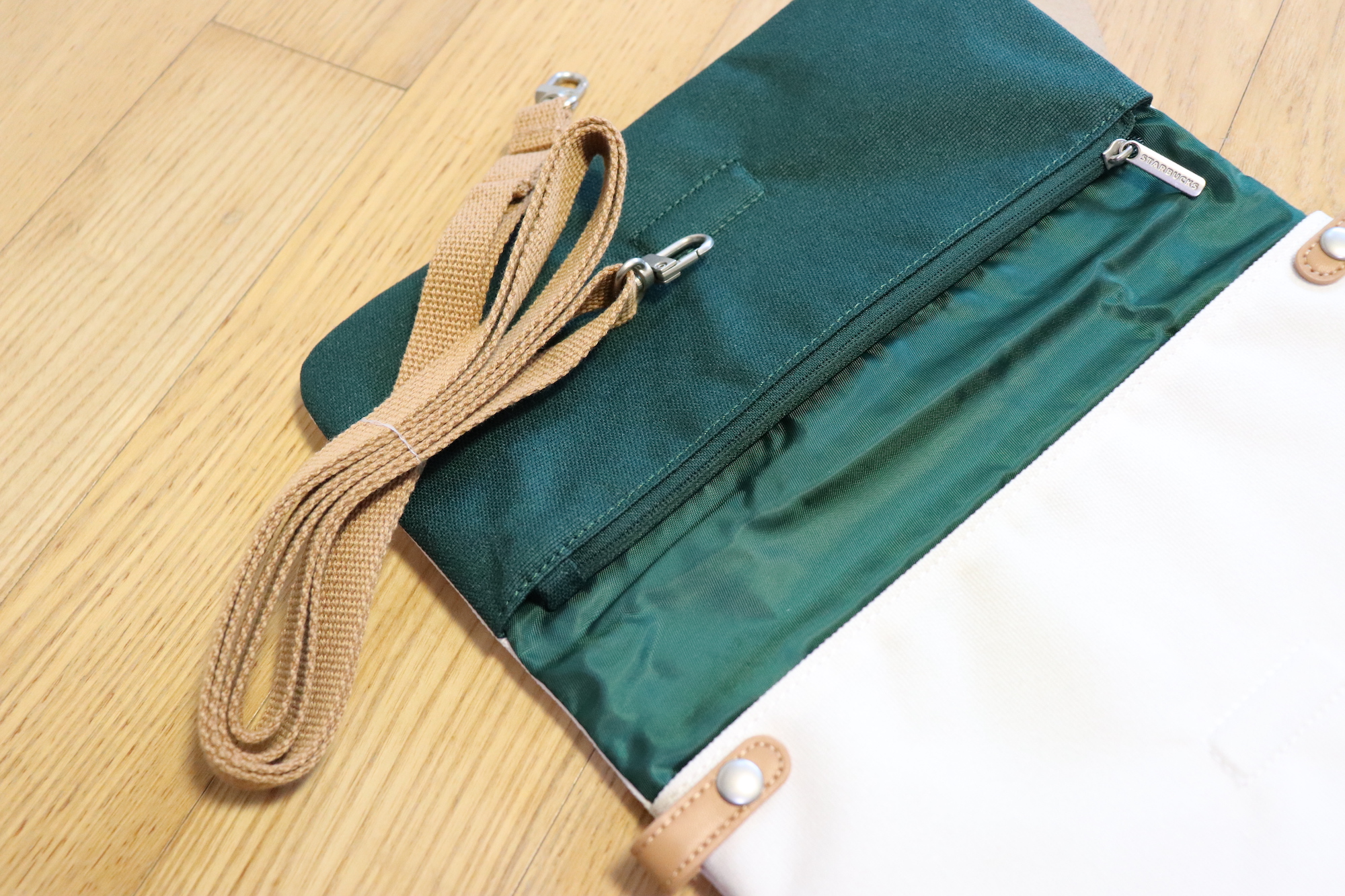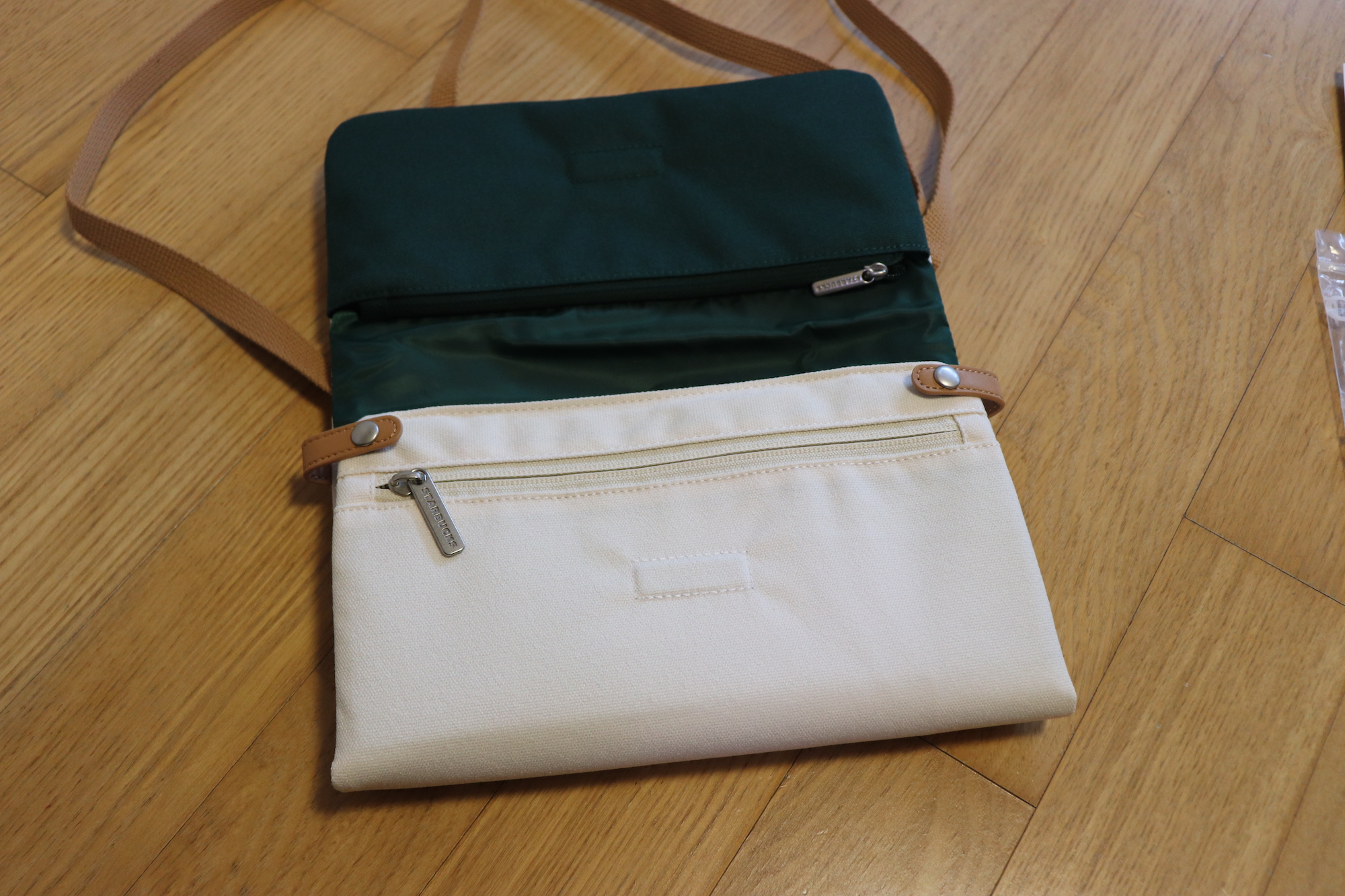 크로스백을 열면 윗부분에 지퍼가 있어 작은 소품들을 수납할 수 있다. 크림 색상의 겉감과 그린 색상의 안감, 그리고 브라운 색상의 스트랩까지 너무 마음에 드는 조합이다.