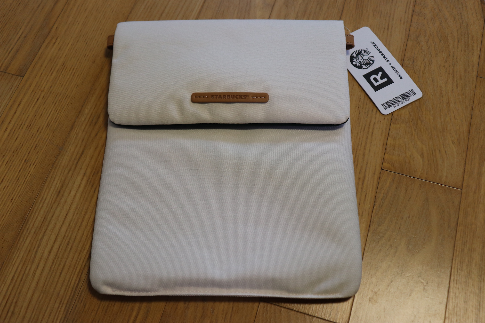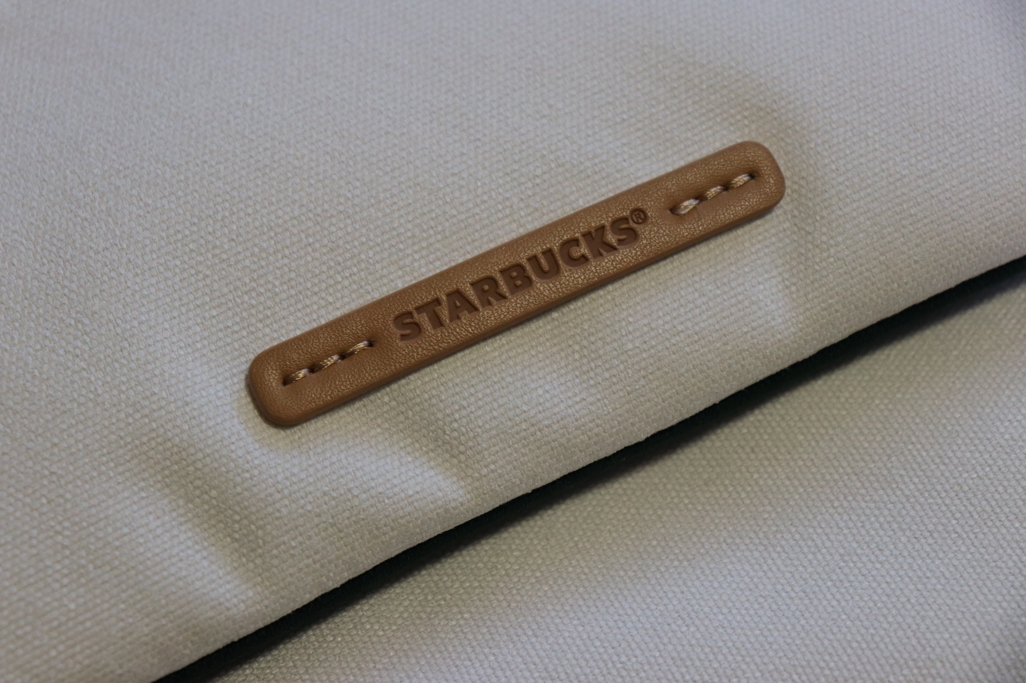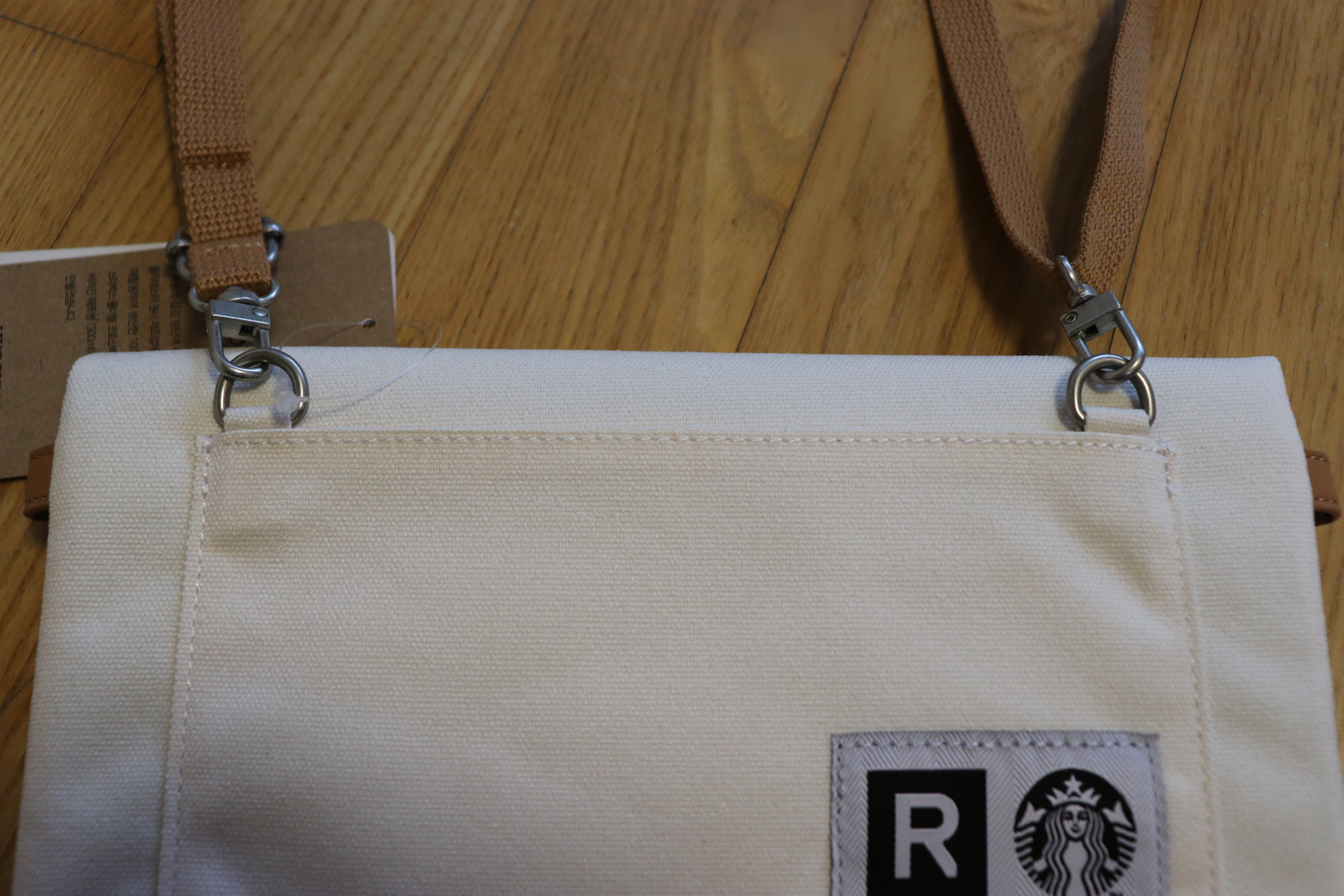 가방 디자인은 심플 그 자체인데 앞쪽에 STARUCKS 라고 새겨진 가죽 텍이 부착되어 있다.