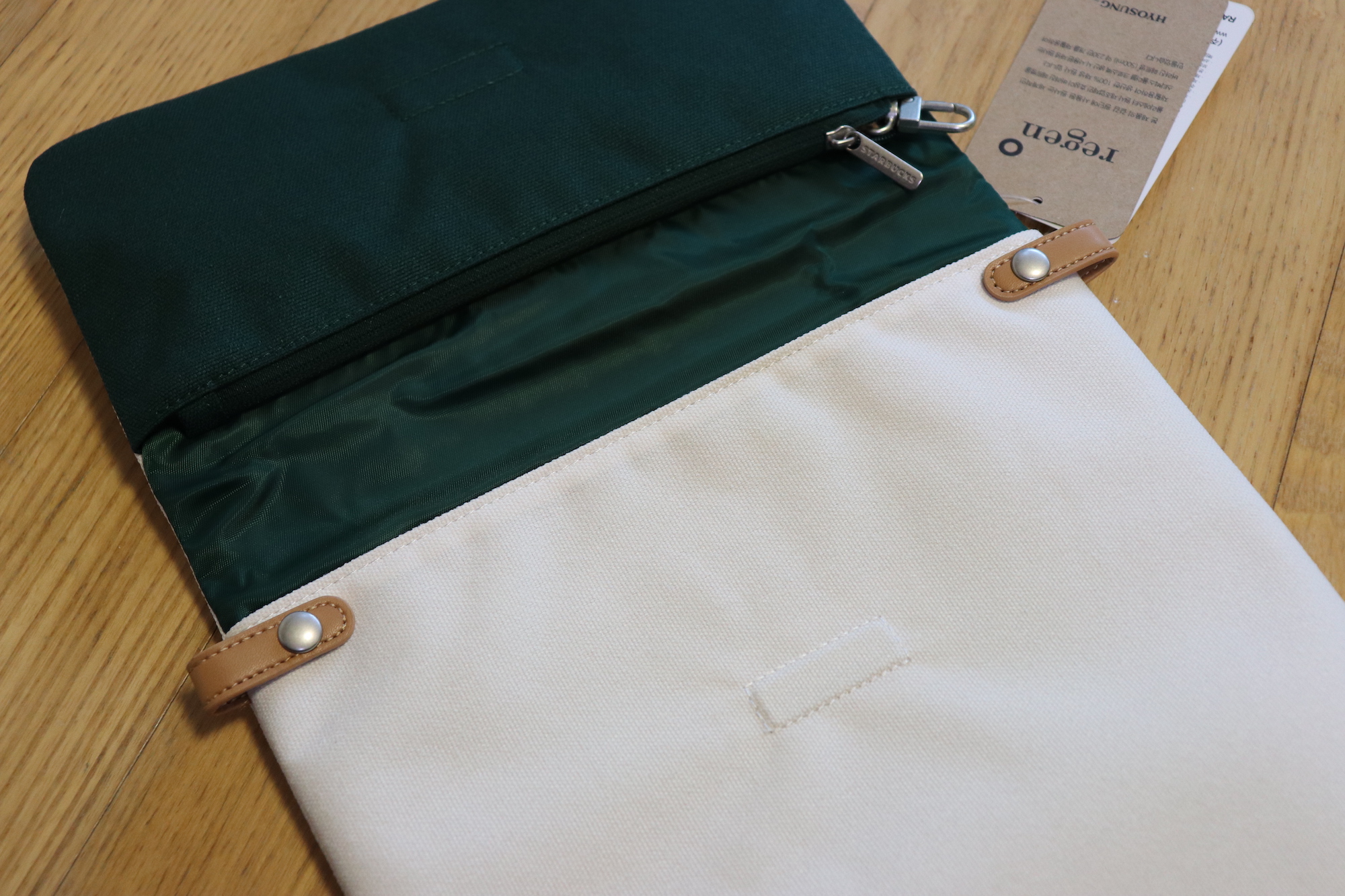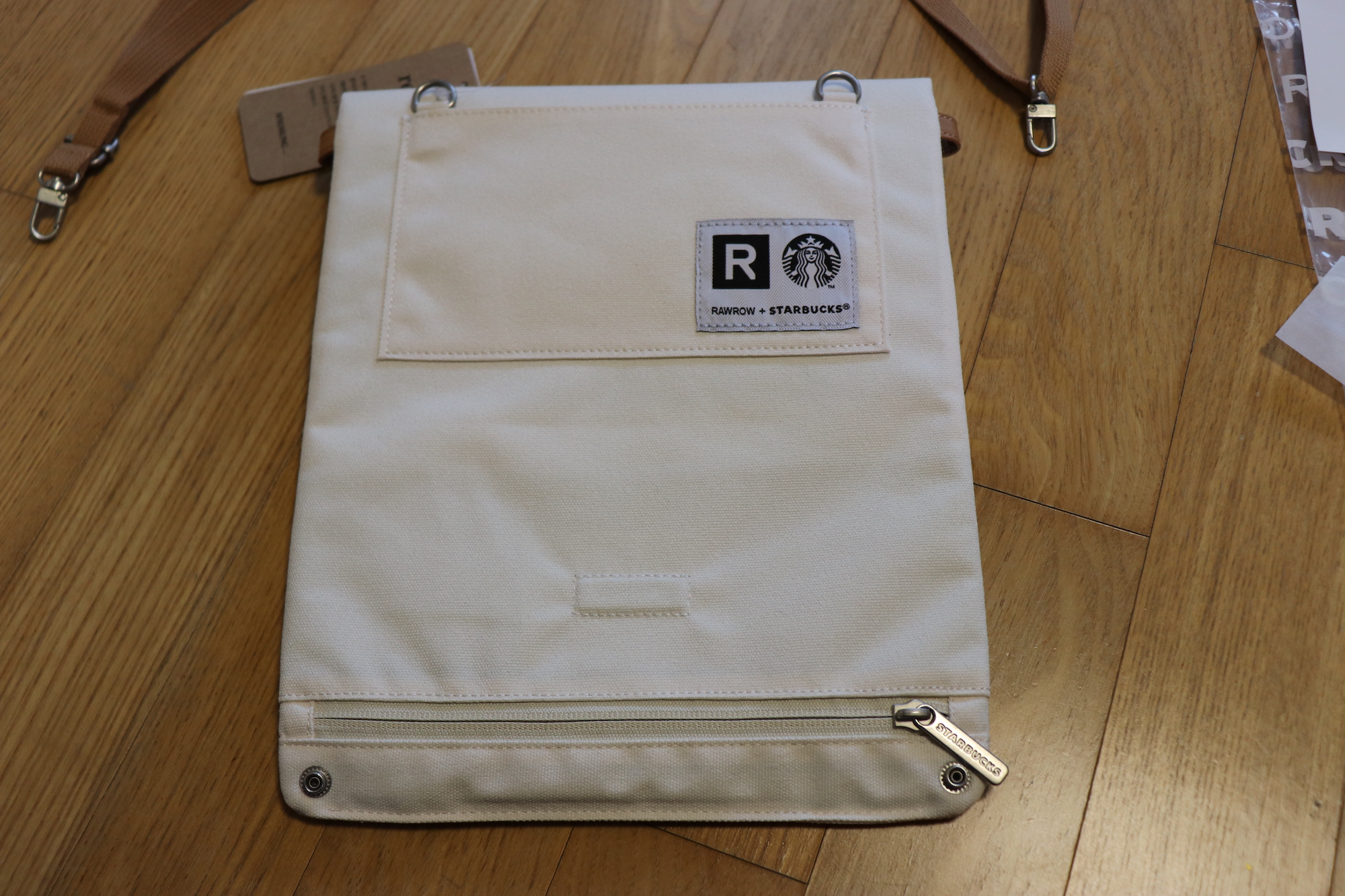 RAWROW와 STARBUCKS의 콜라보~ 환경을 생각하는 스타벅스와 세계적인 원사 제조업체 효성이 함께 하였다는 텍이 붙어있다. 이 제품의 겉감 원단에 사용된 원사는 세계적인 폴리에스터원사 제조업체인 효성이 버려진 페트병을 재활용하여 생산한 100% 재생 원사이다. 스타벅스 폴더블 크로스백 생산 시 사용된 재생 원사는 버려진 페트병 500ml 기준으로 약 230만개를 재활용하여 만들었다고 하니 정말 대단한 것 같다.