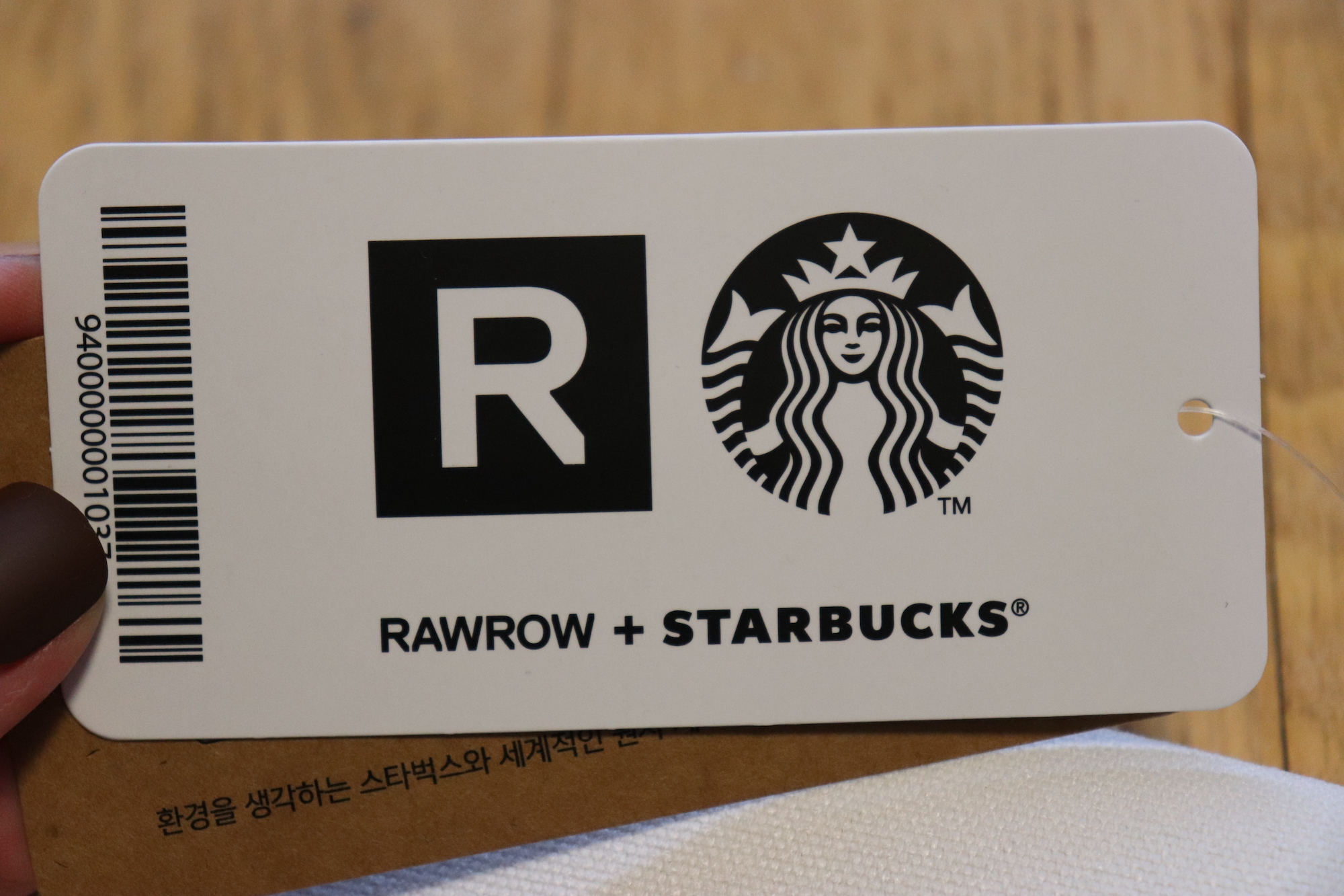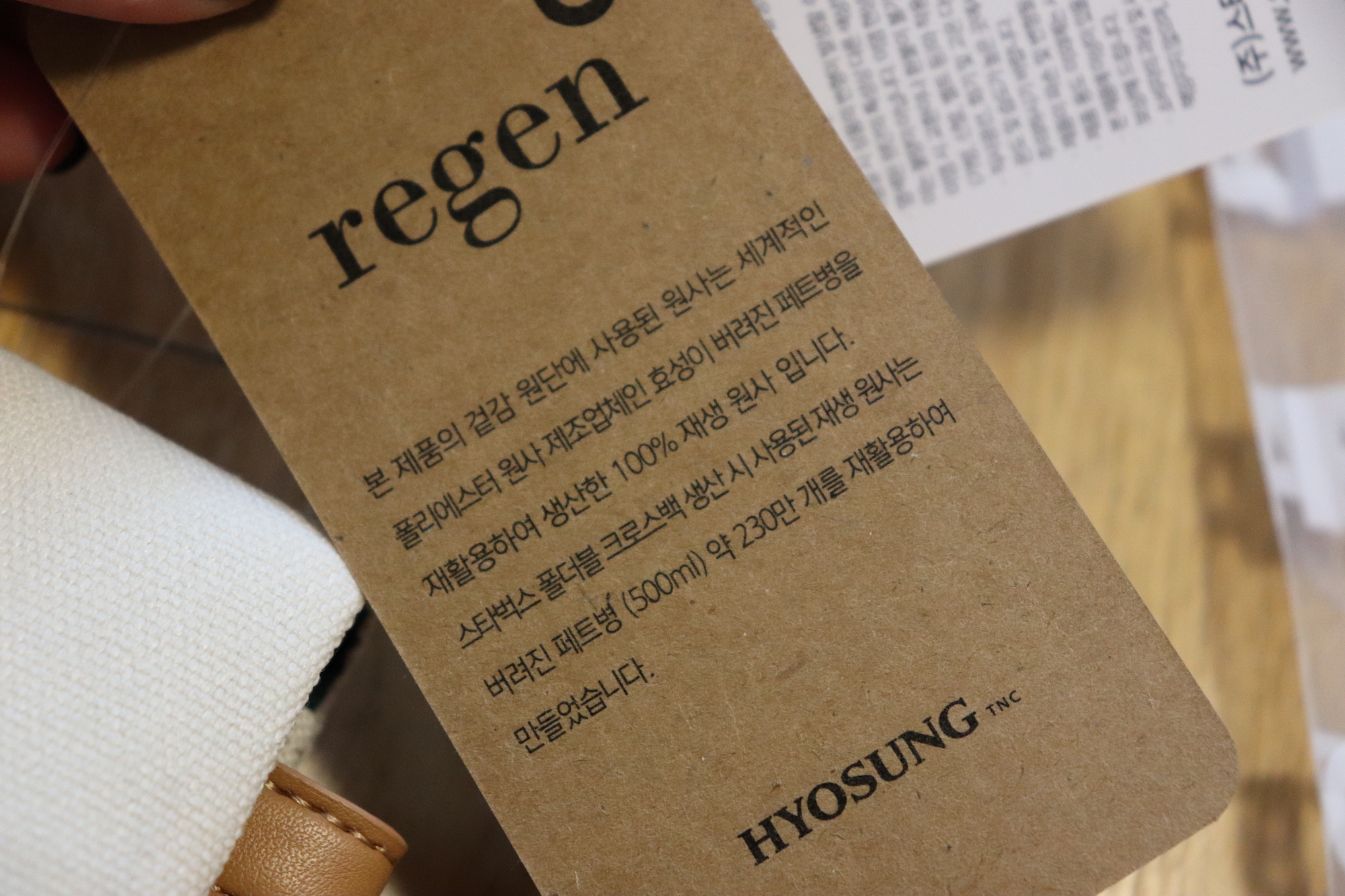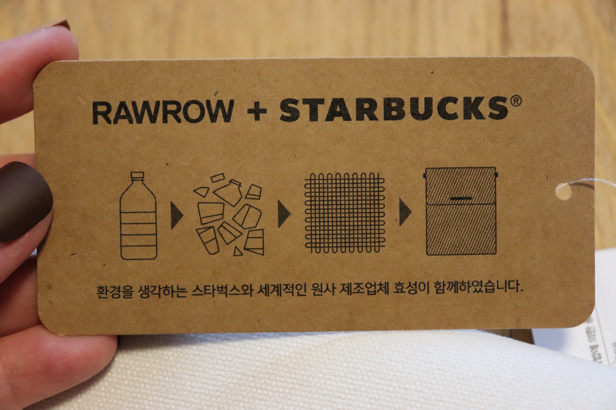 RAWROW와 STARBUCKS의 콜라보~ 환경을 생각하는 스타벅스와 세계적인 원사 제조업체 효성이 함께 하였다는 텍이 붙어있다. 이 제품의 겉감 원단에 사용된 원사는 세계적인 폴리에스터원사 제조업체인 효성이 버려진 페트병을 재활용하여 생산한 100% 재생 원사이다. 스타벅스 폴더블 크로스백 생산 시 사용된 재생 원사는 버려진 페트병 500ml 기준으로 약 230만개를 재활용하여 만들었다고 하니 정말 대단한 것 같다.