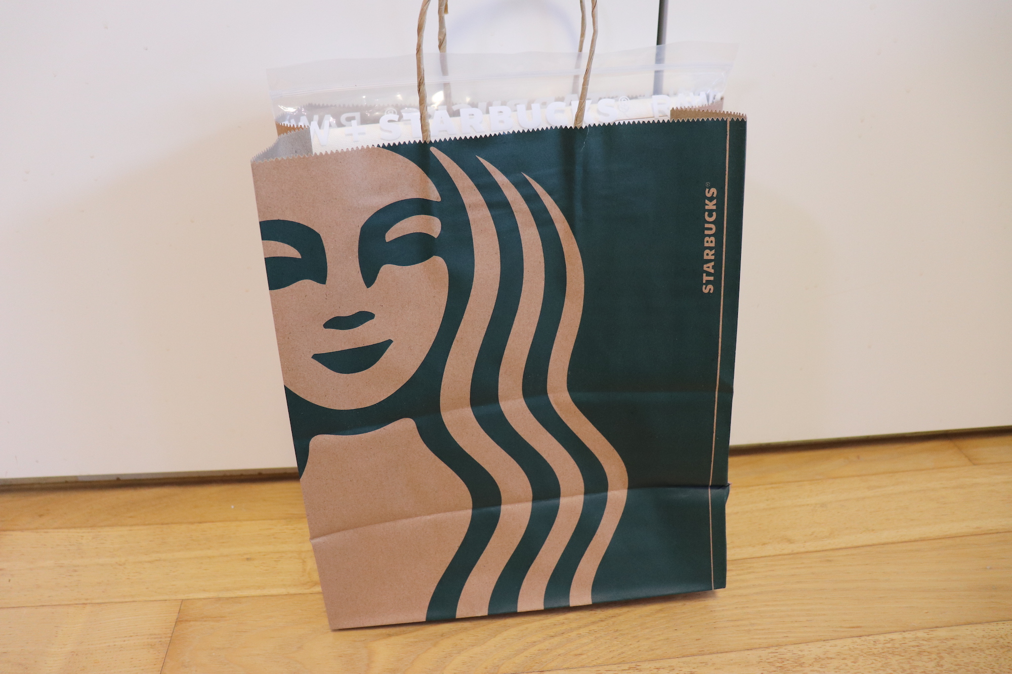 가방 디자인은 심플 그 자체인데 앞쪽에 STARUCKS 라고 새겨진 가죽 텍이 부착되어 있다.