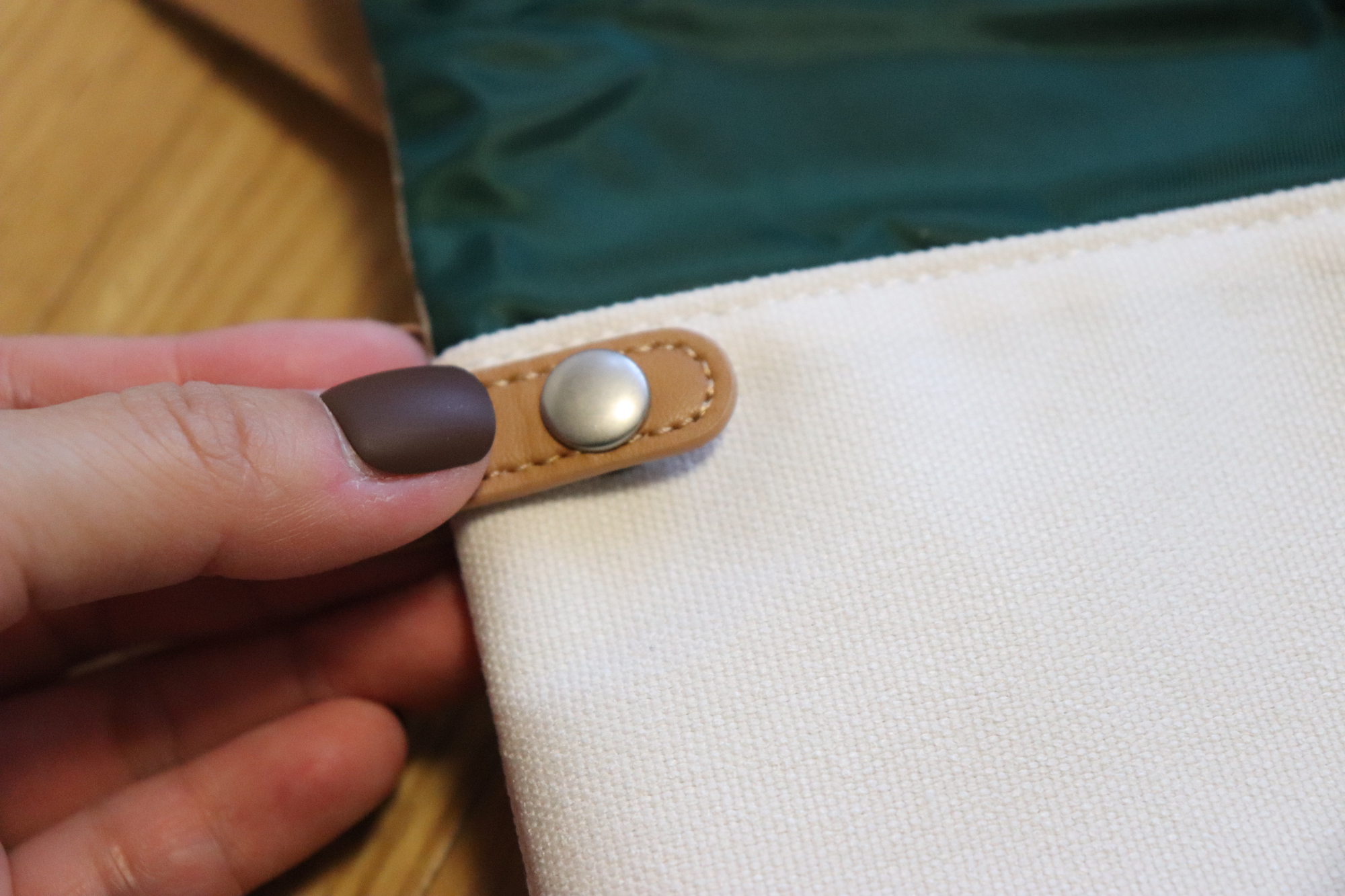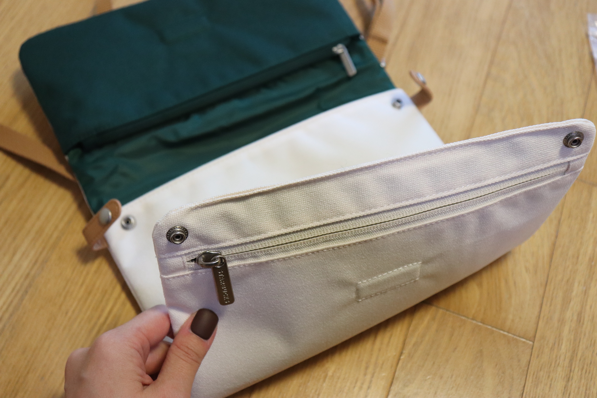 크로스백을 열면 윗부분에 지퍼가 있어 작은 소품들을 수납할 수 있다. 크림 색상의 겉감과 그린 색상의 안감, 그리고 브라운 색상의 스트랩까지 너무 마음에 드는 조합이다.