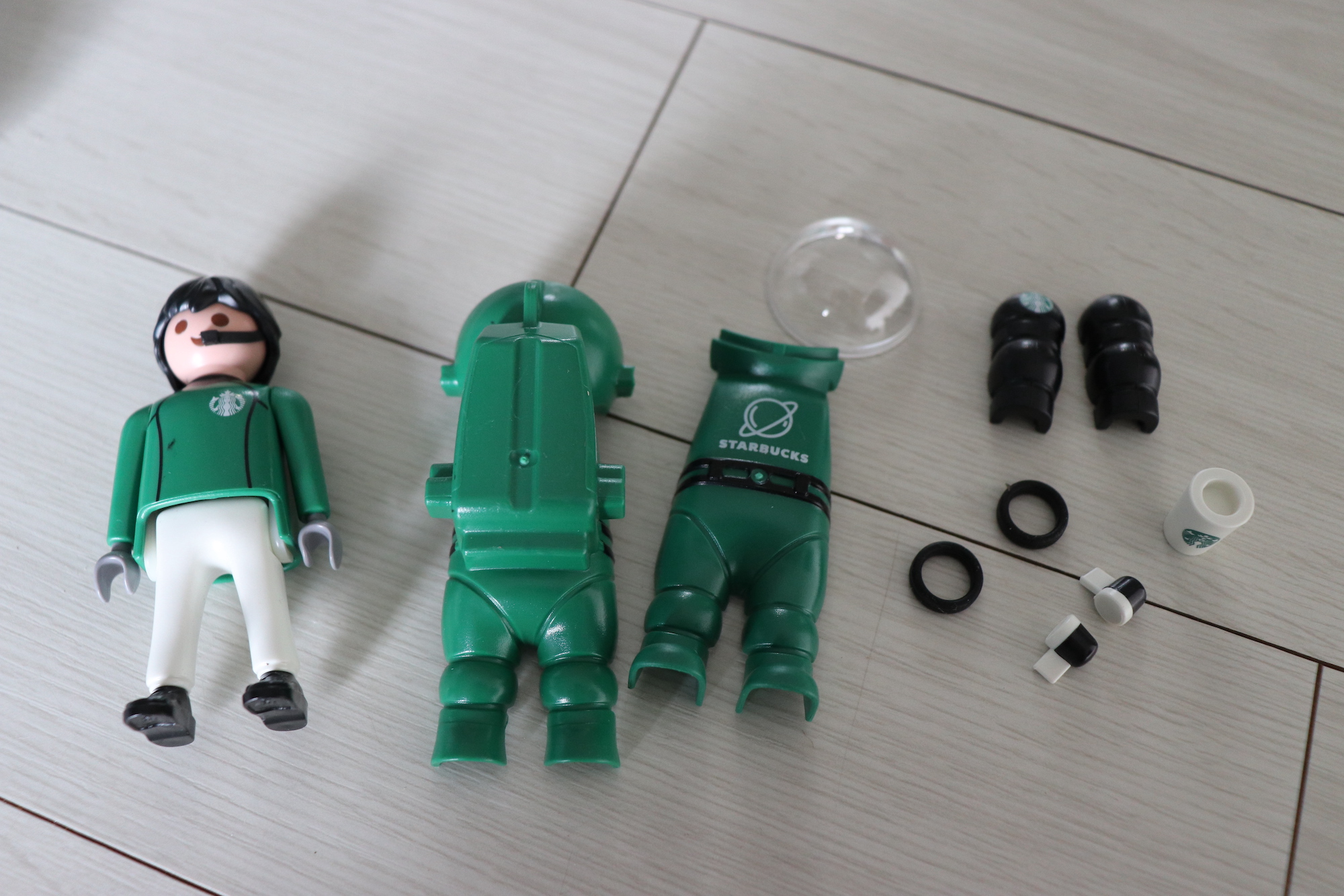 비닐 포장을 뜯으면 본체(사람)와 우주복(앞/뒤), 얼굴을 보호해줄 유리, 팔 보호대 2개, 스타벅스 컵, 그리고 고무링 2개와 이어폰(?) 2개가 들어있다. 본격 조립을 시작해 볼까?