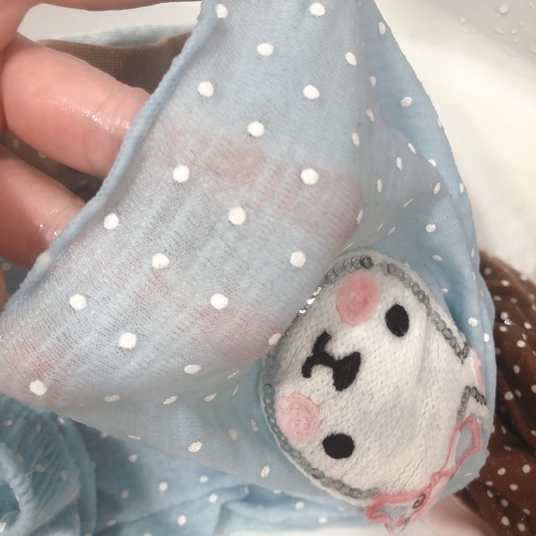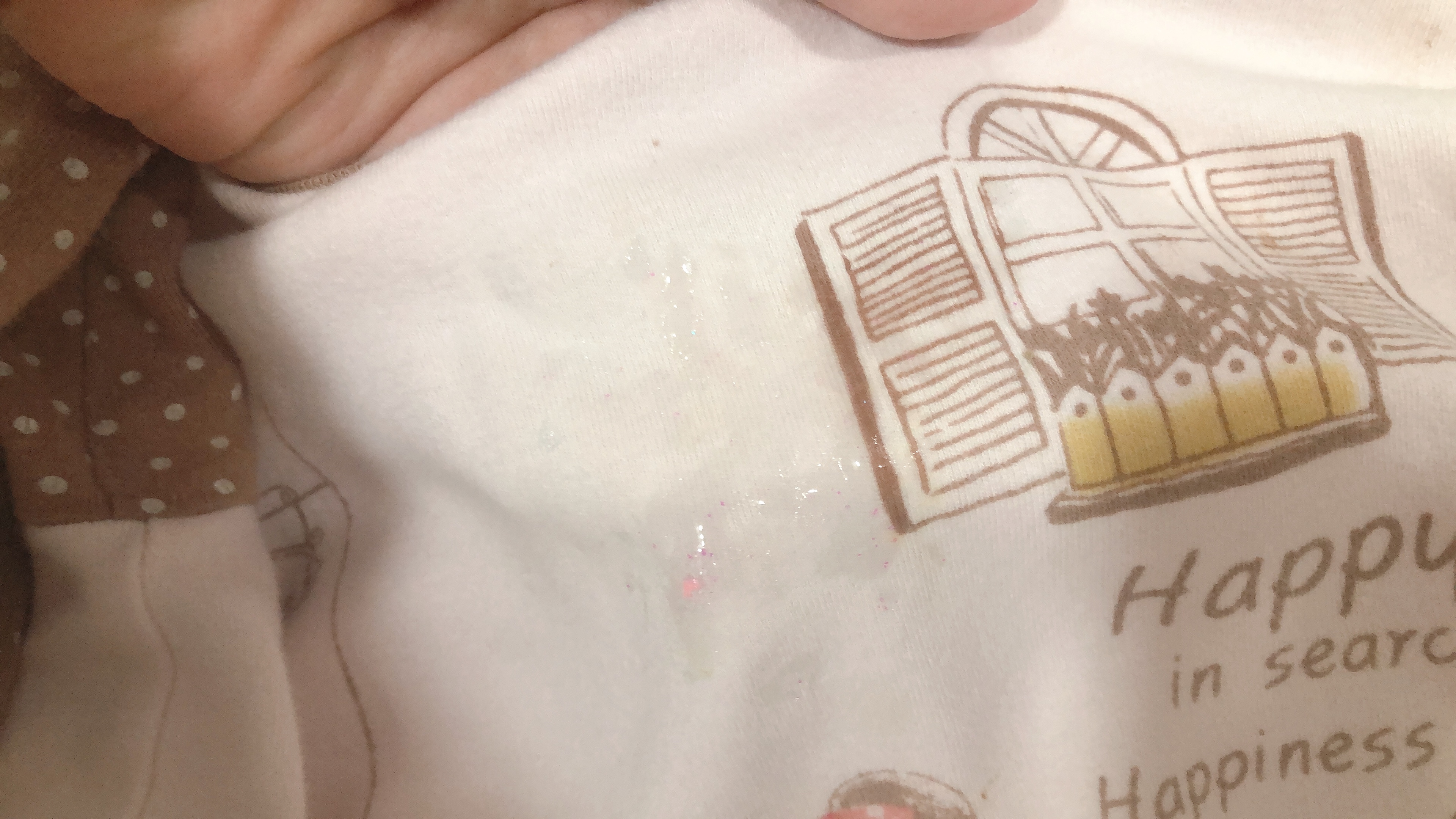 투명한 슬라임 액체라서 사진상으로는 티가 많이 나지 않지만, 내복 상의와 바지 끝단에 슬라임이 붙어서 손으로는 잘 떼어지지 않는다.