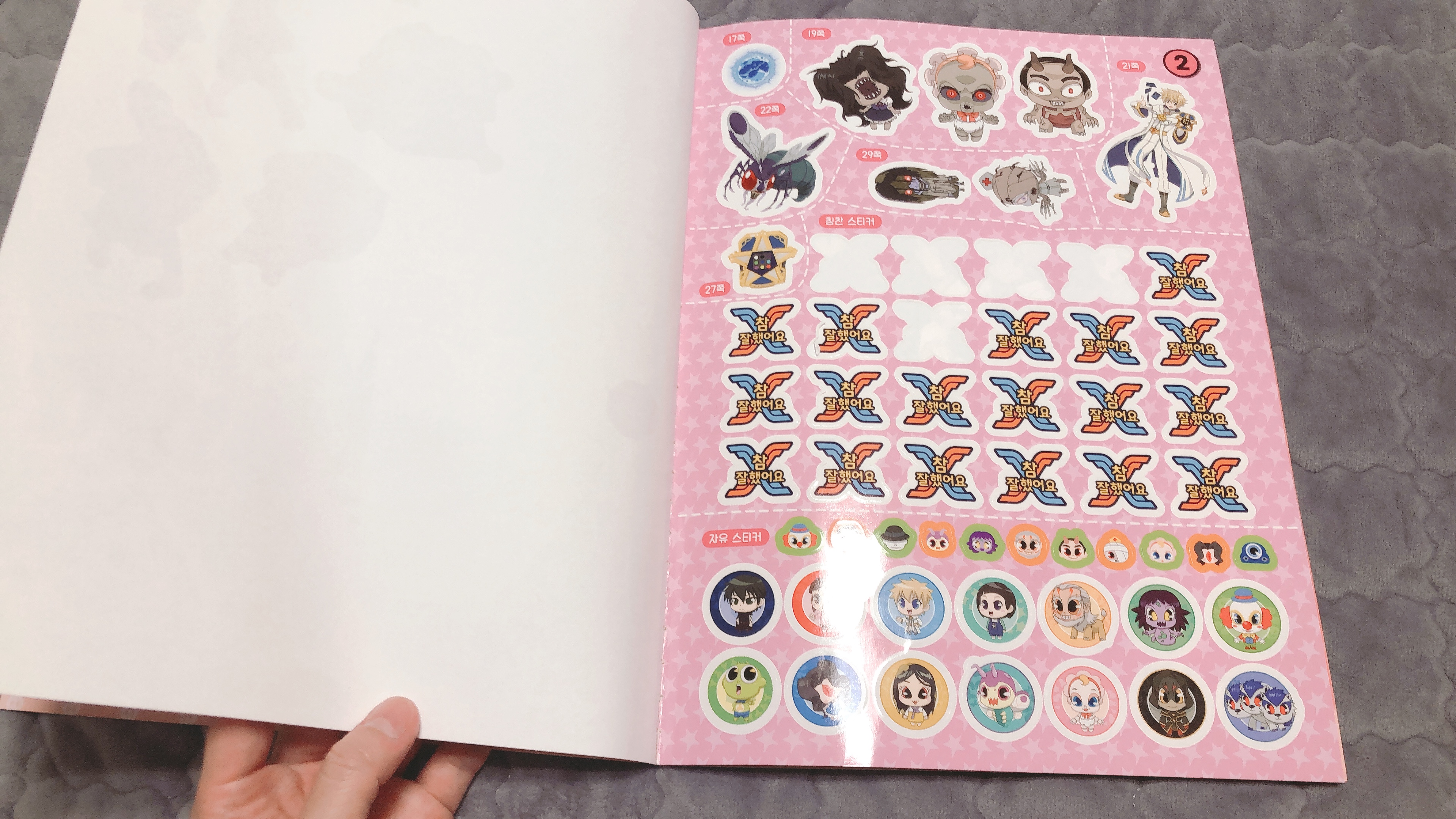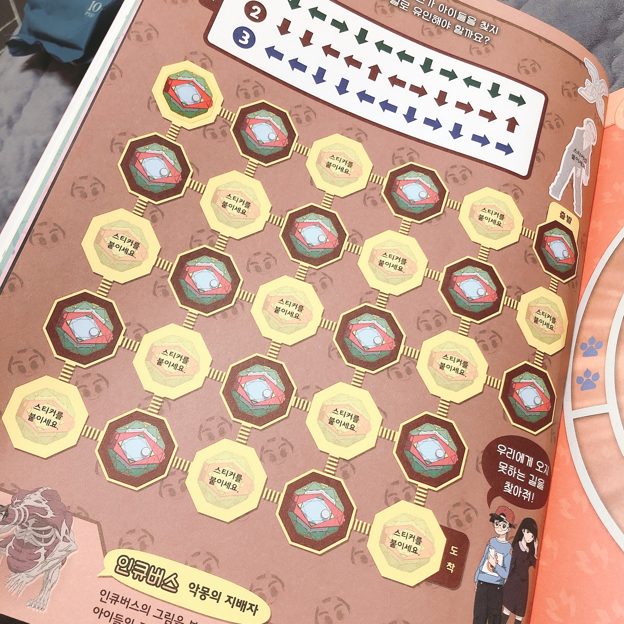 앞 쪽 2장은 신비아파트 캐릭터 스티커로 구성되어 있다. 아이들은 등장인물과 귀신 캐릭터들을 하나하나 손으로 짚어가며 나에게 이름과 특징을 설명해 주었다. 내가 귀신 이름을 기억하지 못하자 지난번에 같이 봤는데 왜 엄마는 기억을 못 하냐며 다람쥐라는 말도 들었다-_-; (다람쥐는 겨울을 대비하여 도토리를 숨겨놓는데, 그 장소를 항상 잊어버린다고 한다.)