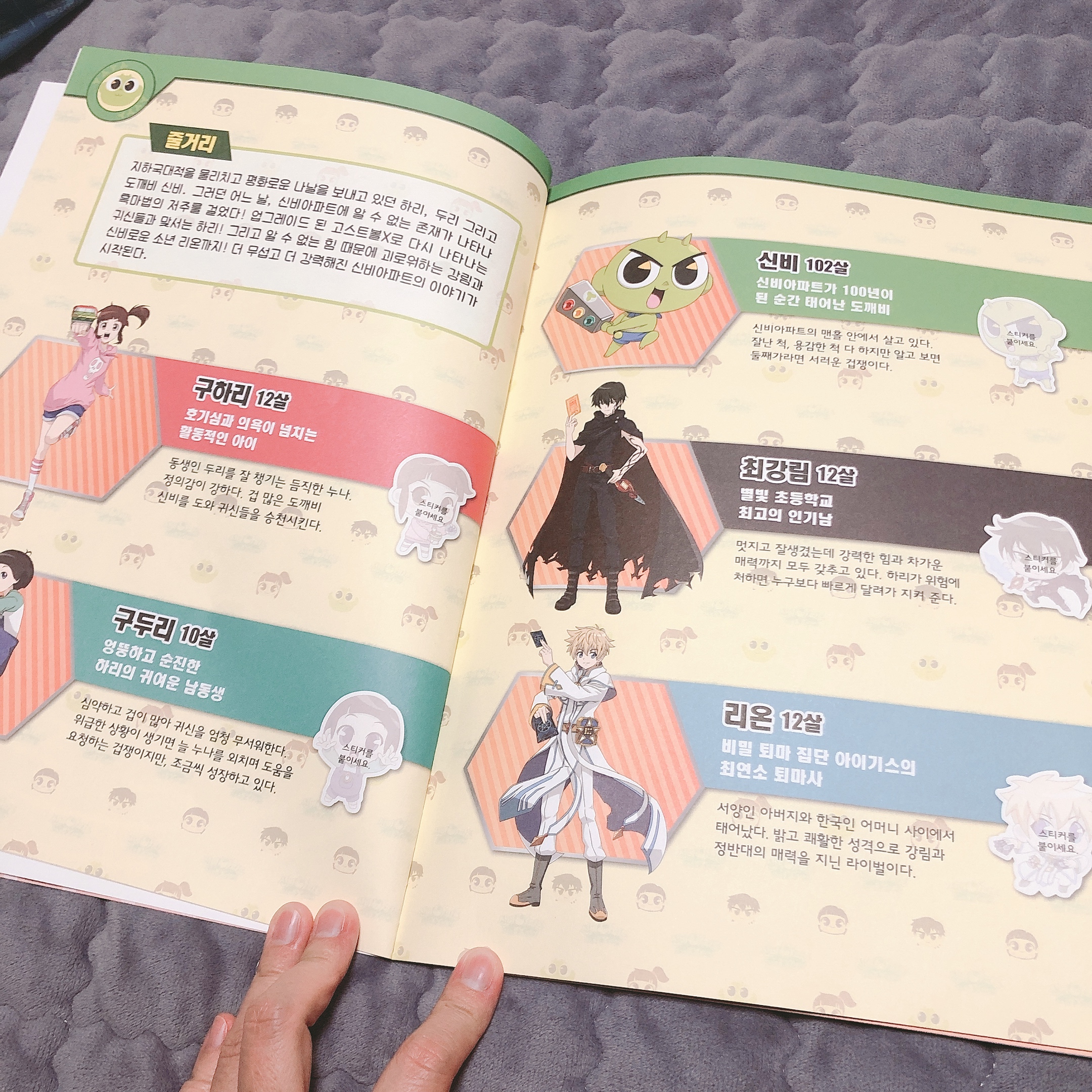 앞 쪽 2장은 신비아파트 캐릭터 스티커로 구성되어 있다. 아이들은 등장인물과 귀신 캐릭터들을 하나하나 손으로 짚어가며 나에게 이름과 특징을 설명해 주었다. 내가 귀신 이름을 기억하지 못하자 지난번에 같이 봤는데 왜 엄마는 기억을 못 하냐며 다람쥐라는 말도 들었다-_-; (다람쥐는 겨울을 대비하여 도토리를 숨겨놓는데, 그 장소를 항상 잊어버린다고 한다.)