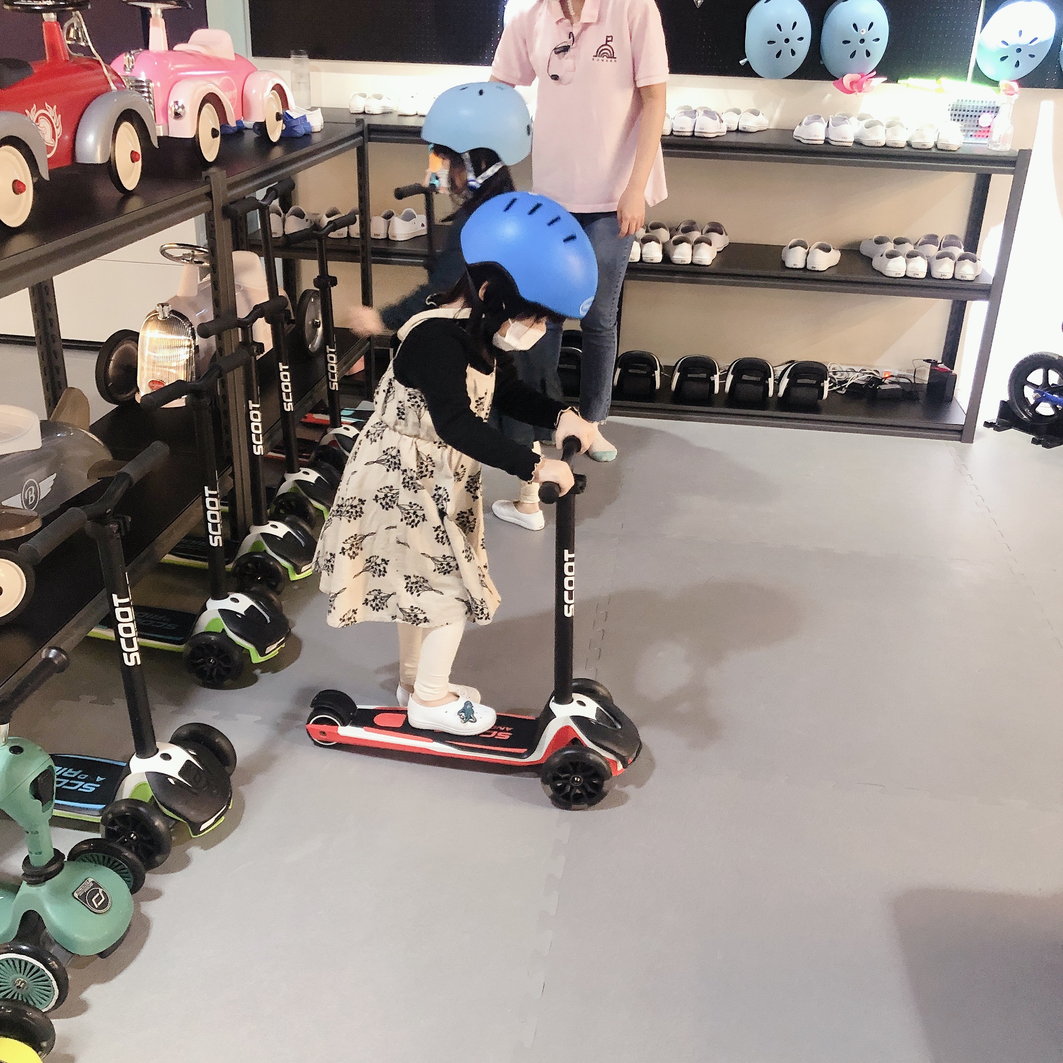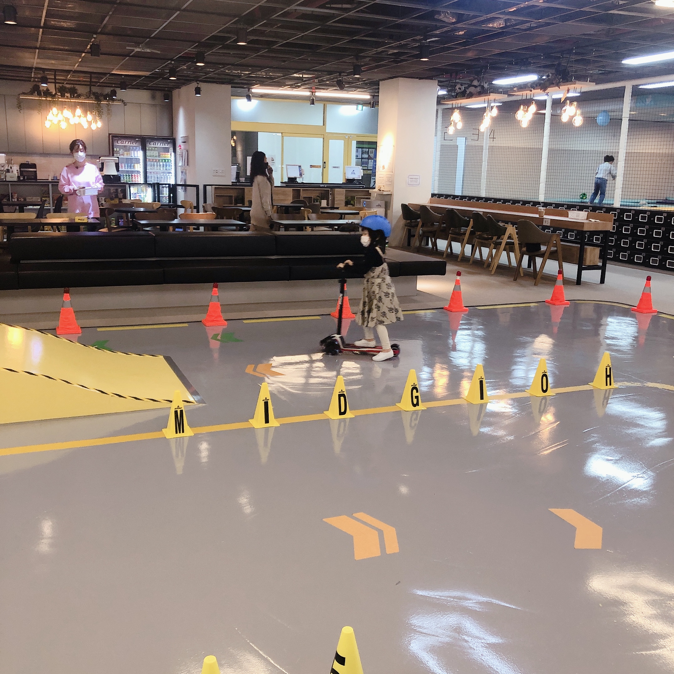 하요미, 소요미는 가장 먼저 킥보드와 자전거를 골라서 열심히 트랙을 돌았다. 사고 방지를 위해서 헬멧과 실내화를 꼼꼼하게 착용하니 안심이었다.