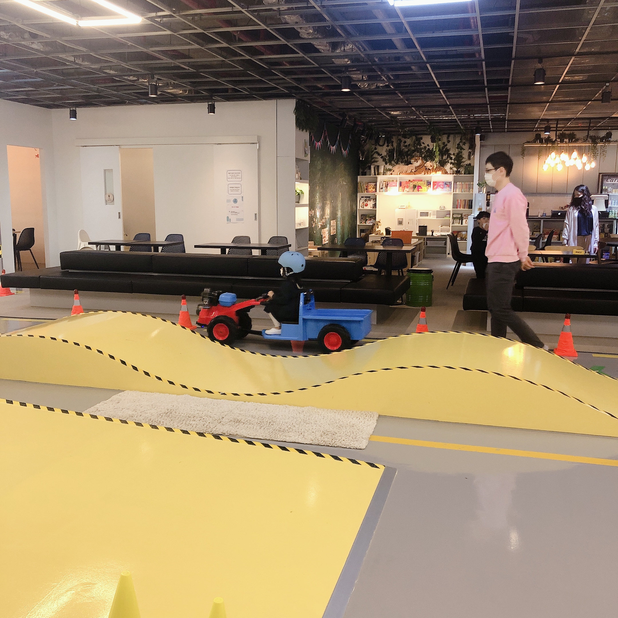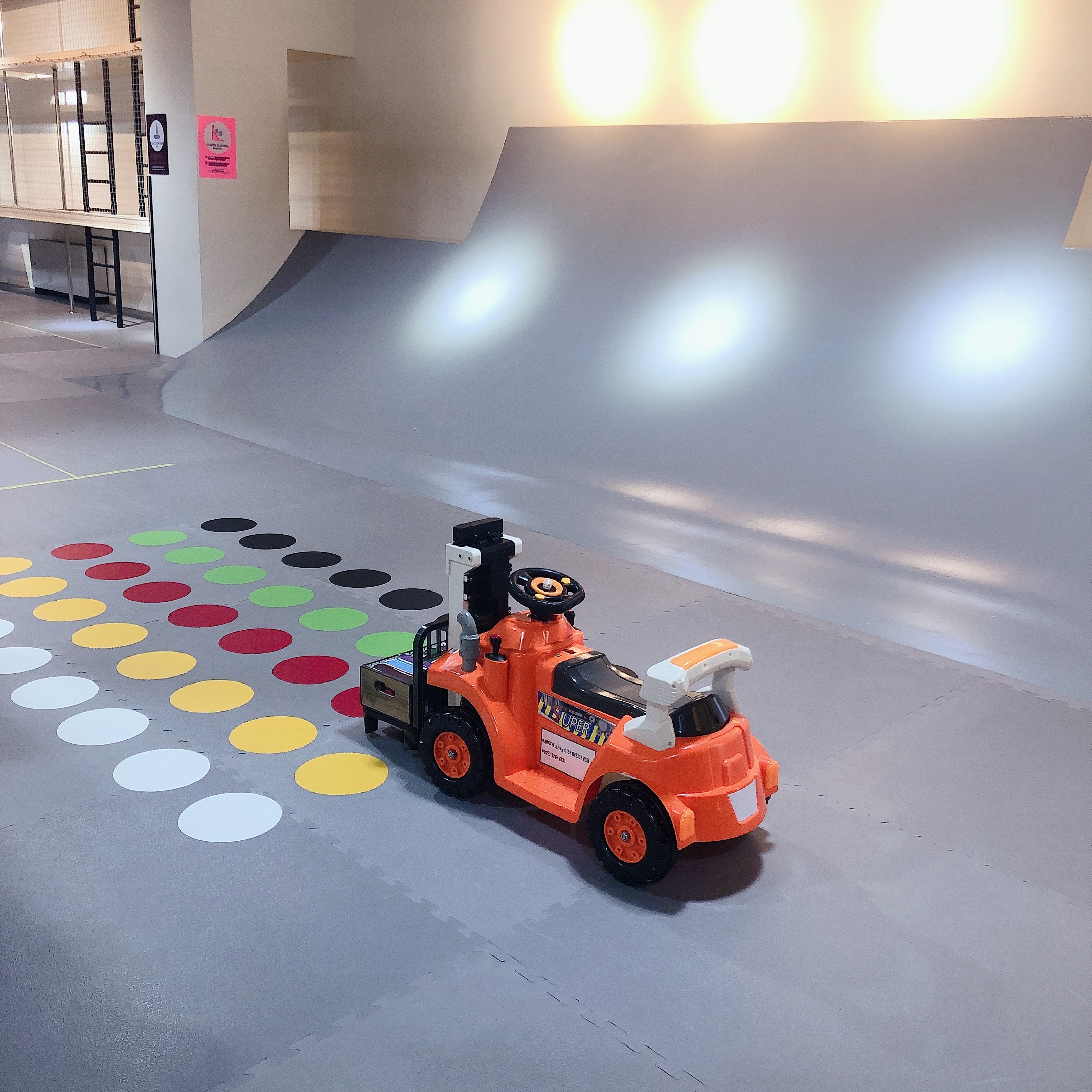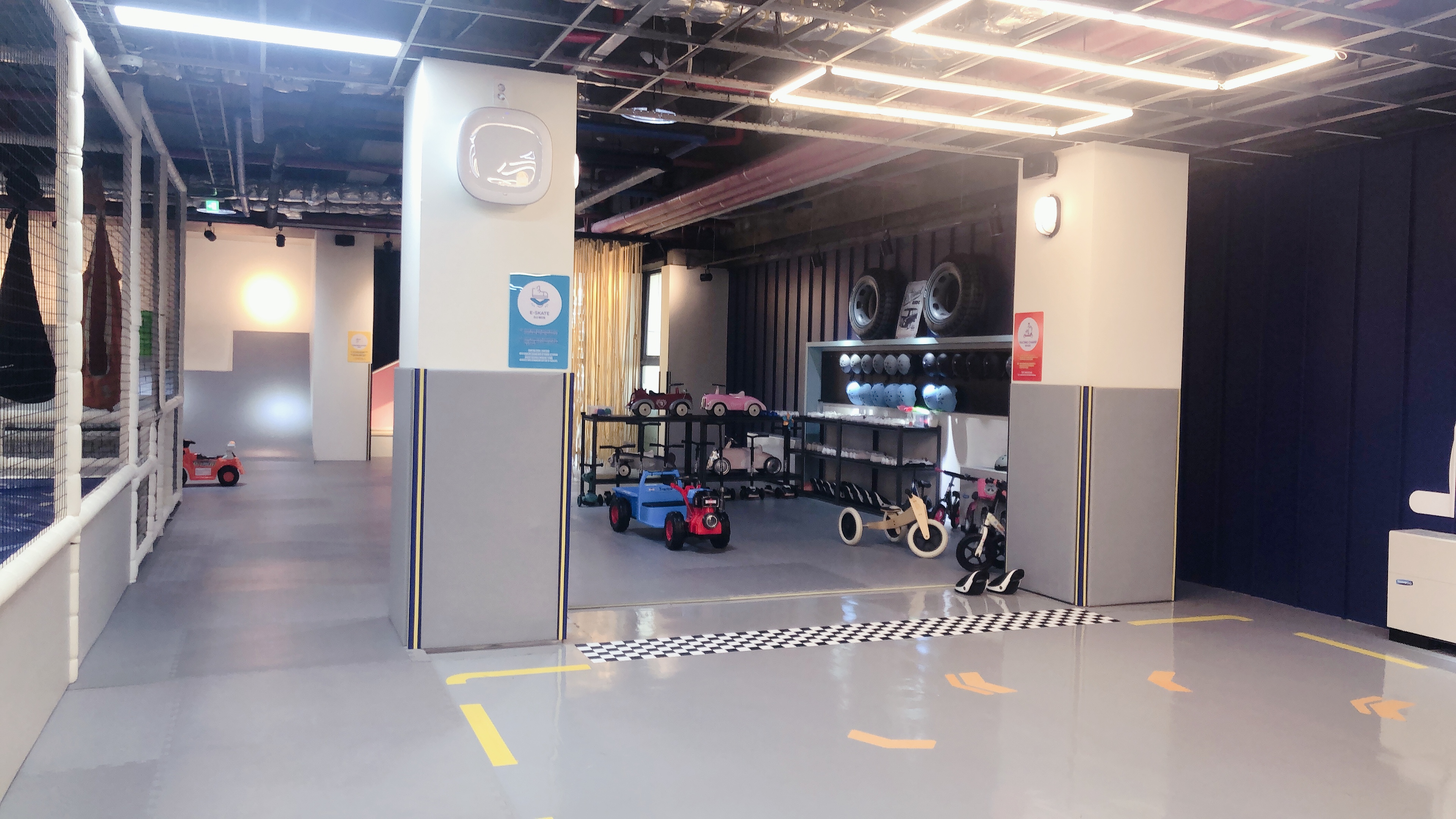 휴식공간 옆쪽으로 길다란 레일이 있다. 벙커키즈에서 가장 넓은 공간이다. 반대쪽에서 킥보드, 자전거 등 각종 탈 것을 선택하여 레일을 따라 한바퀴 돌고 오는 것이다. 좀 더 스릴을 원하는 아이들을 위해 장애물도 놓여 있다.