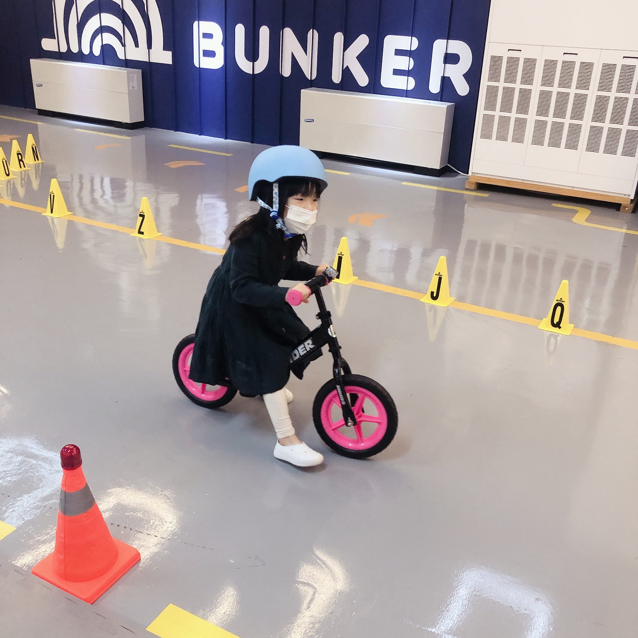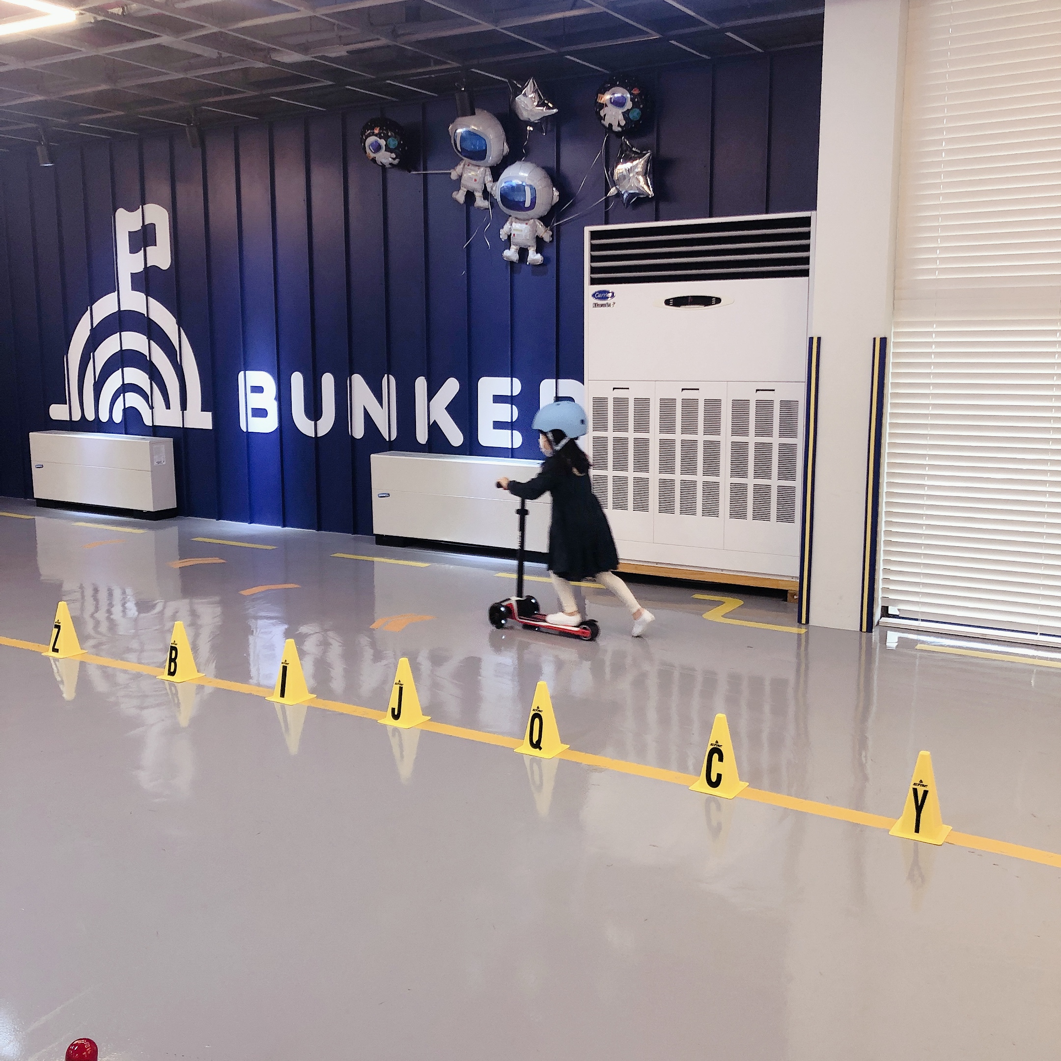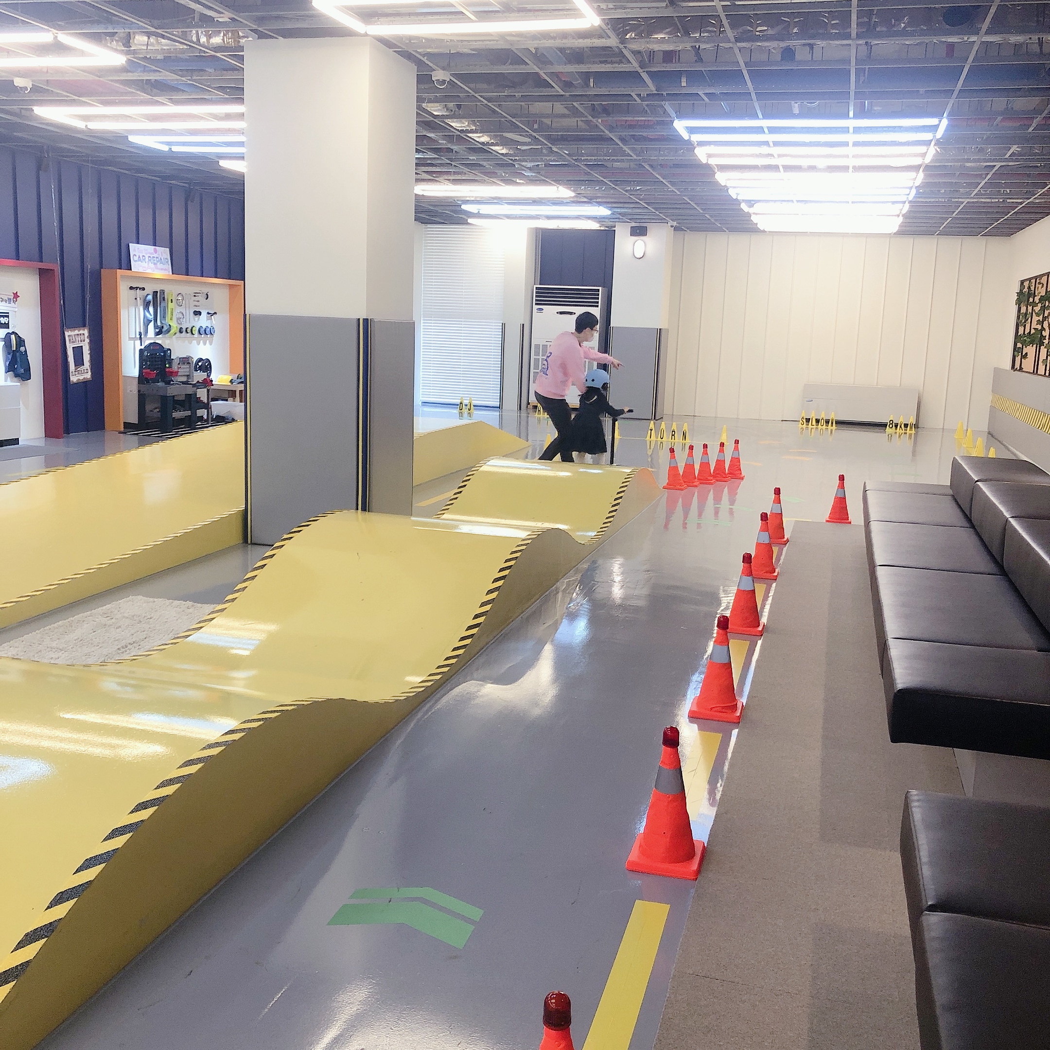 휴식공간 옆쪽으로 길다란 레일이 있다. 벙커키즈에서 가장 넓은 공간이다. 반대쪽에서 킥보드, 자전거 등 각종 탈 것을 선택하여 레일을 따라 한바퀴 돌고 오는 것이다. 좀 더 스릴을 원하는 아이들을 위해 장애물도 놓여 있다.