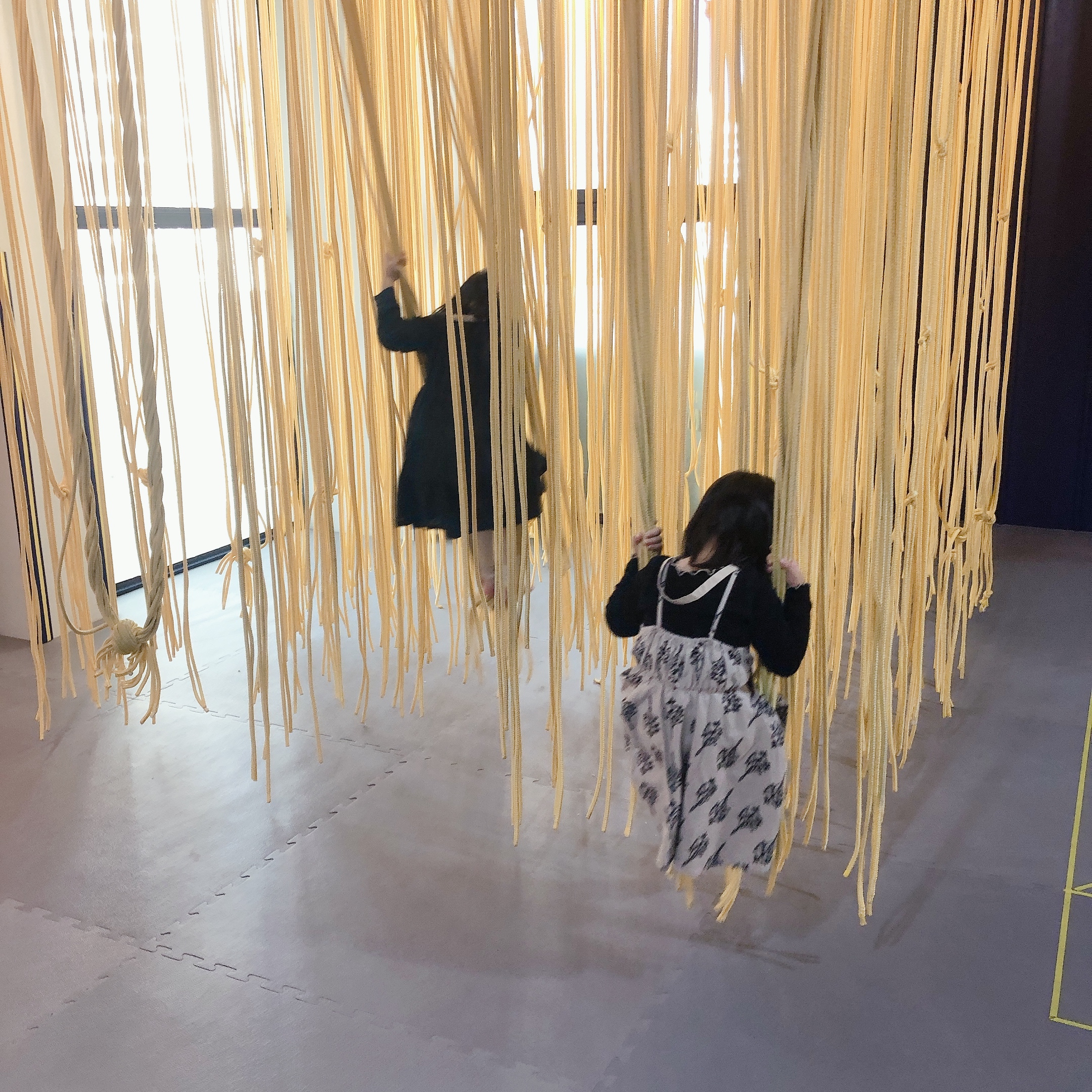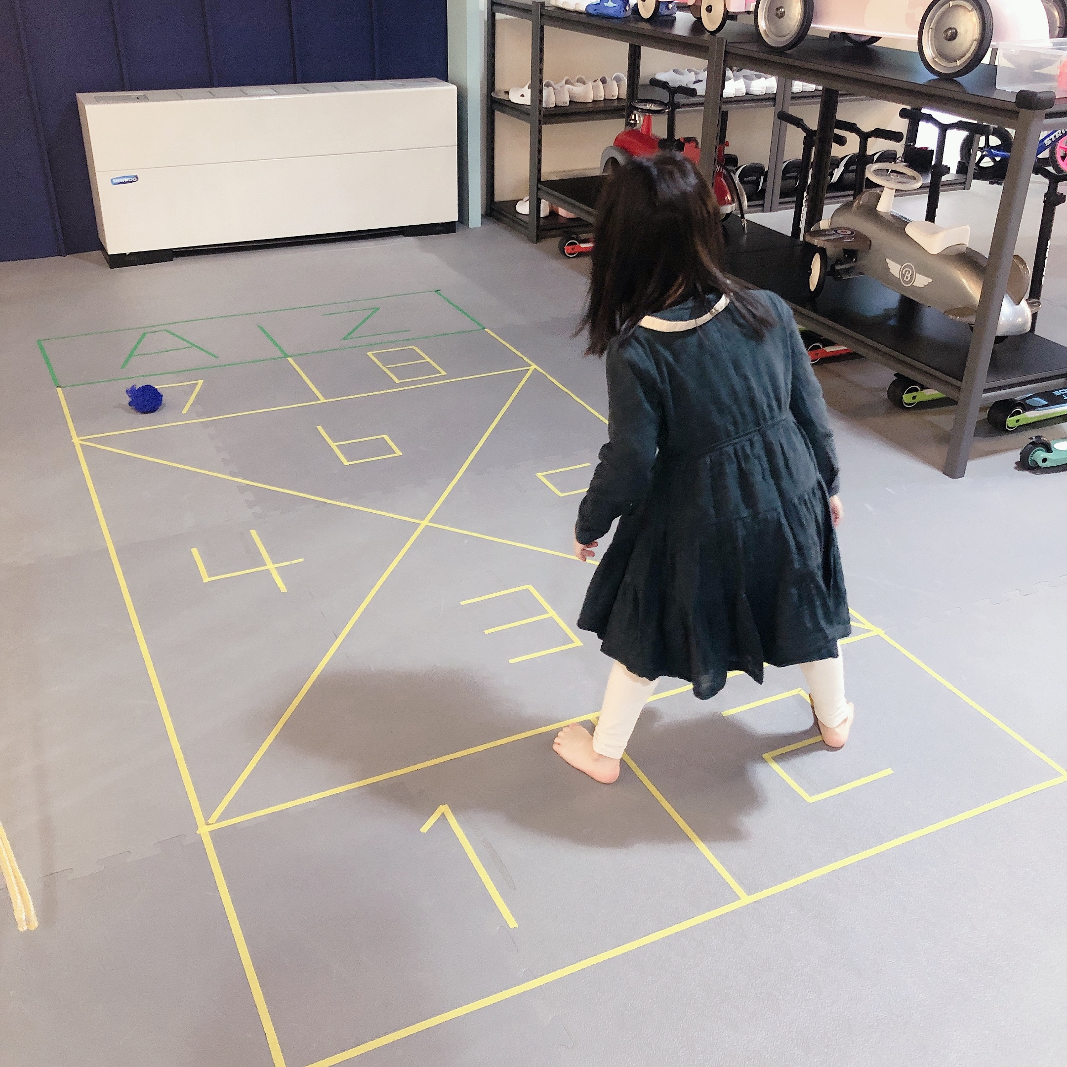 방방장 위에는 풍선, 인형 등이 여기저기 놓여 있는데 둘째 소요미는 커다란 뱀 인형에 매료되었다. (집에 가야 한다고 하니 "큰 뱀아 큰 뱀아"하면서 엉엉 울었다는... 그래서 뱀 인형 사주려고 네이버스토어 장바구니에 넣어 두었지...) 긴 줄에 매달려서 그네도 타 보고, 바로 옆에 그려져 있는 사방치기도 해 보았다.