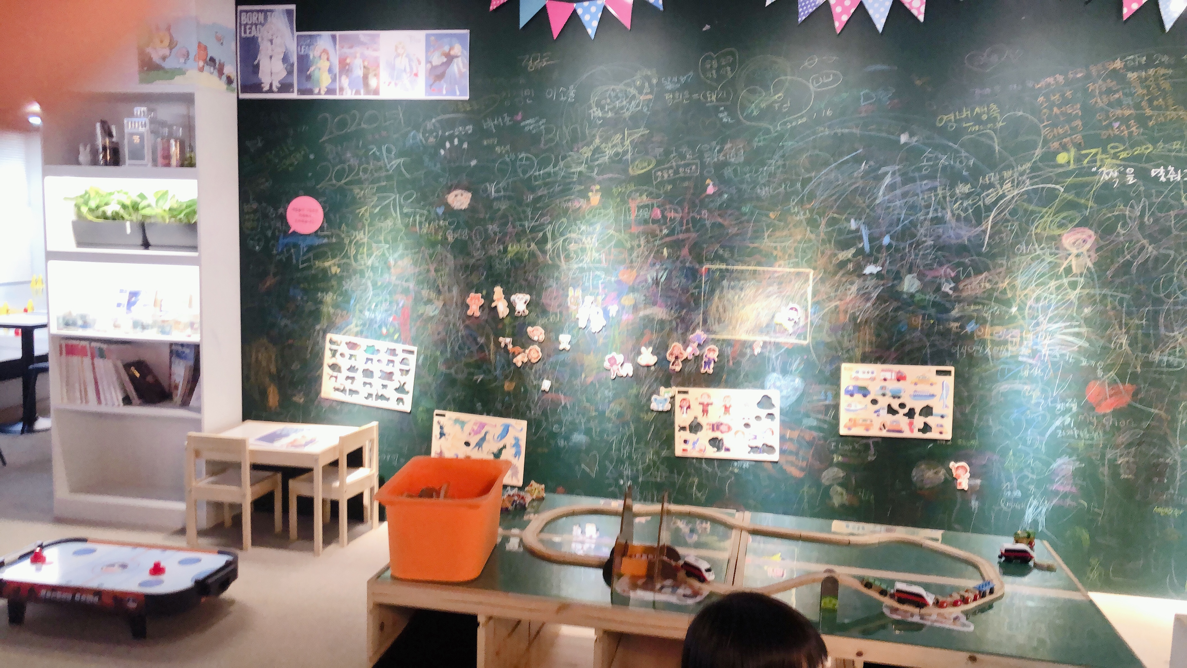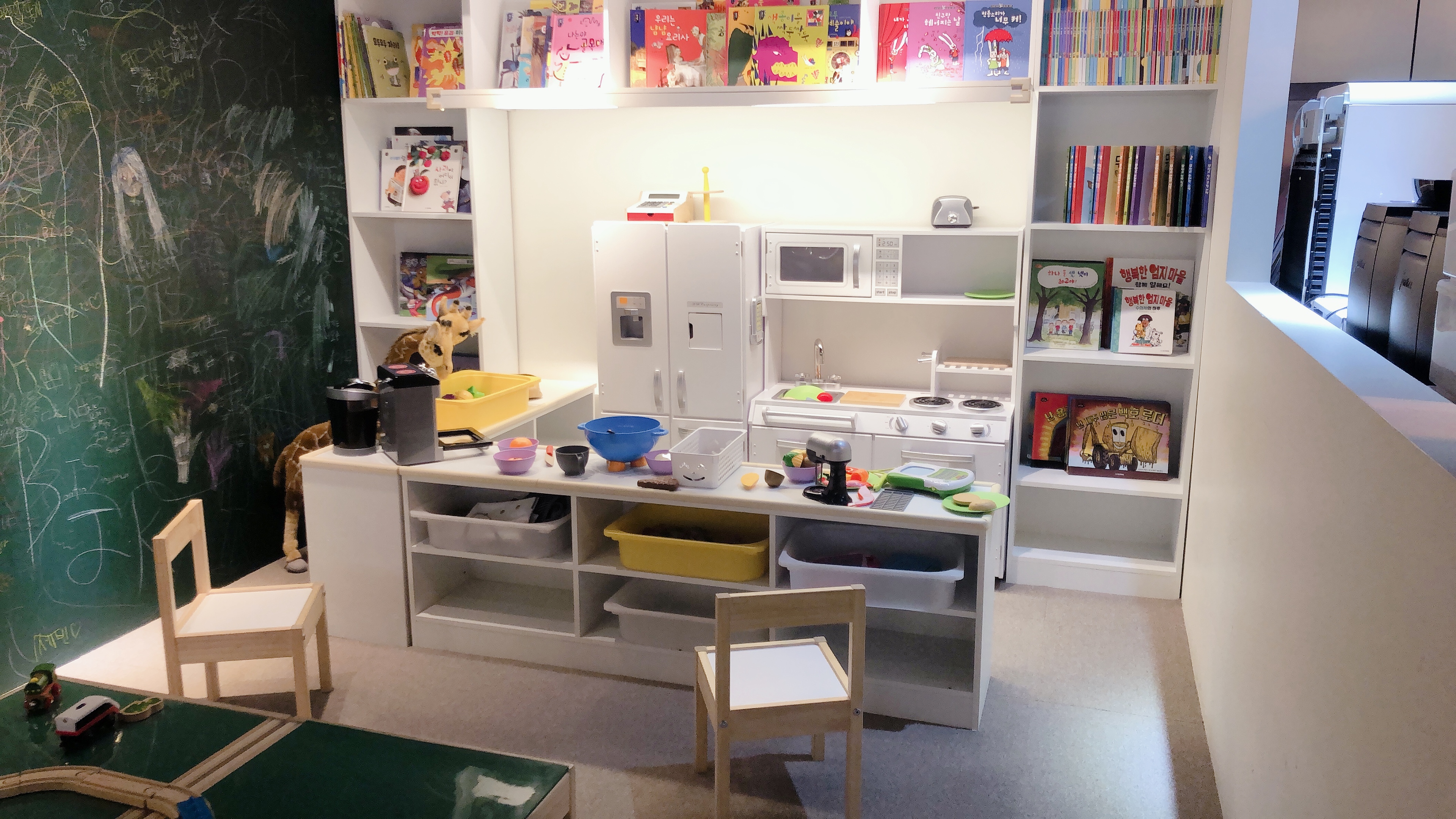 그리고 카운터 옆쪽으로 주방놀이를 할 수 있는 공간과 몇가지 장난감들이 구비되어 있다. 작지만 알차게 이것저것 있을 건 다 있다.