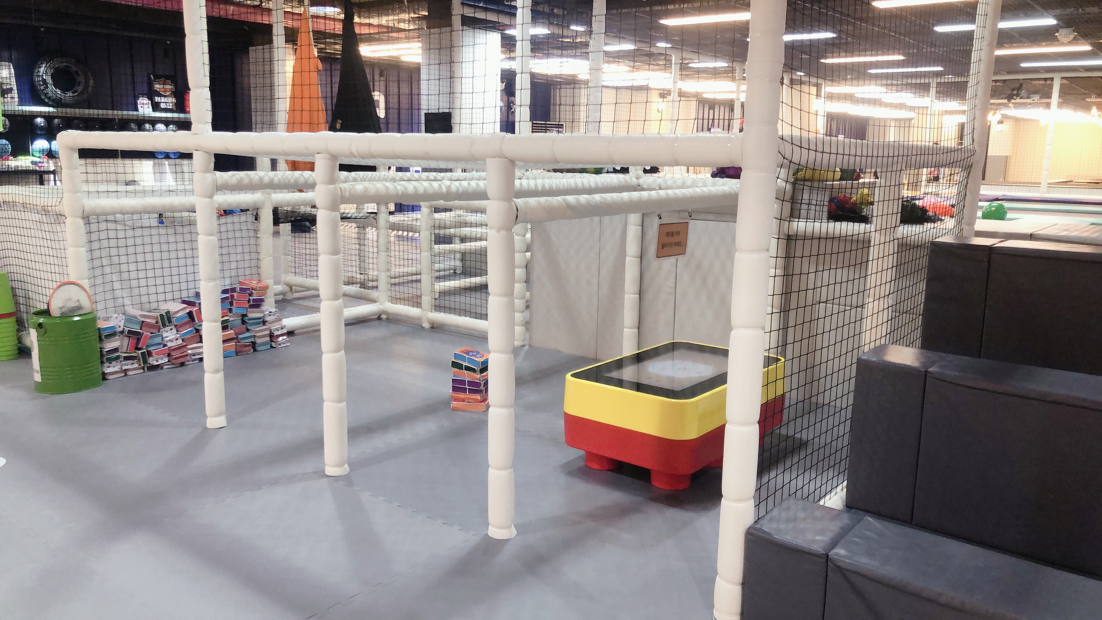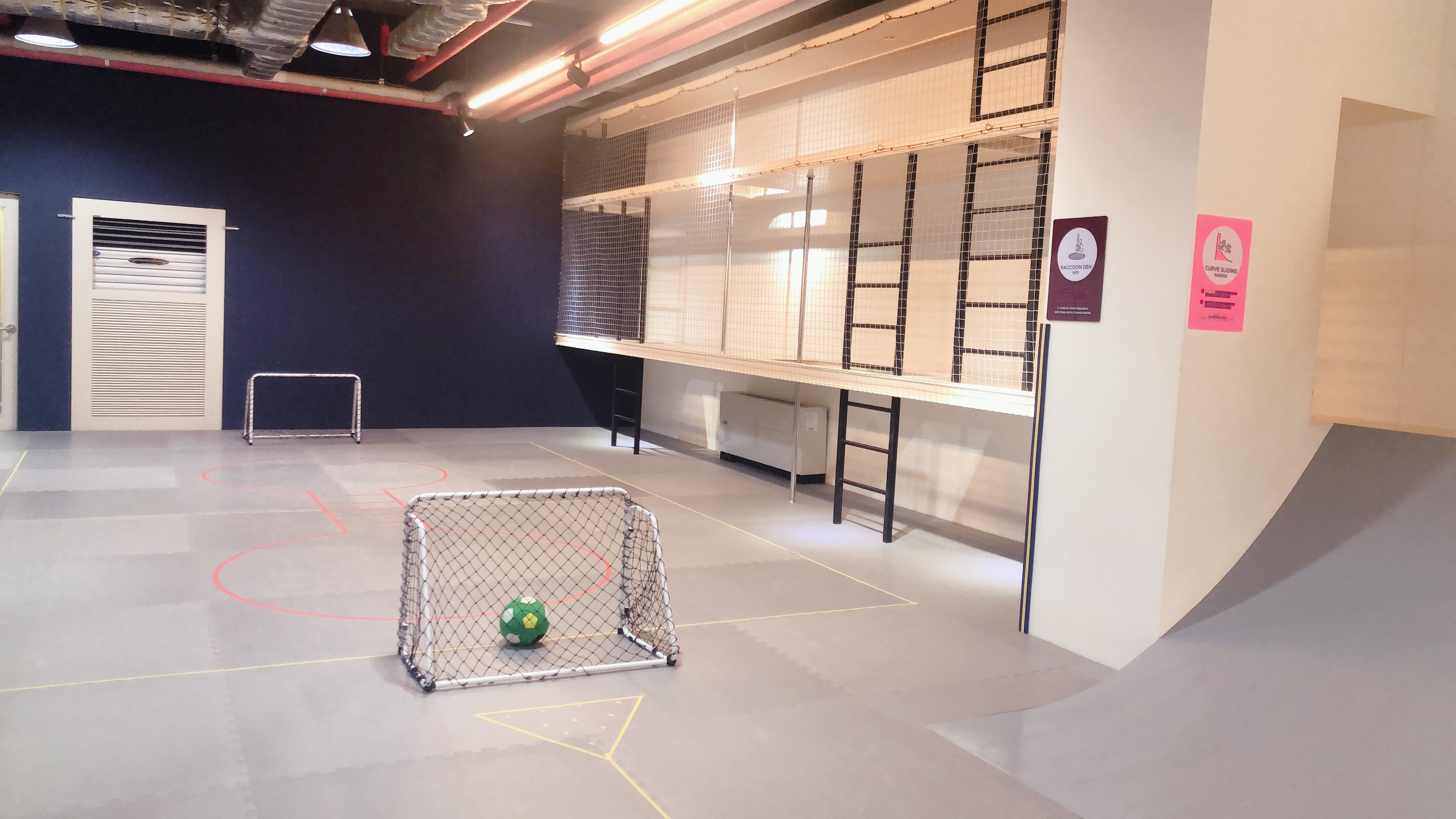 방방장을 따라 코너를 돌면 경사면, 축구장 등 다양한 활동이 가능하도록 구성되어 있다. 벙커키즈는 몸을 움직이는 신체놀이 활동 위주의 공간이라 코로나19 때문에 집콕하여 에너지를 발산할 수 없는 아이들에게 딱 좋은 키즈카페라는 생각이 들었다.