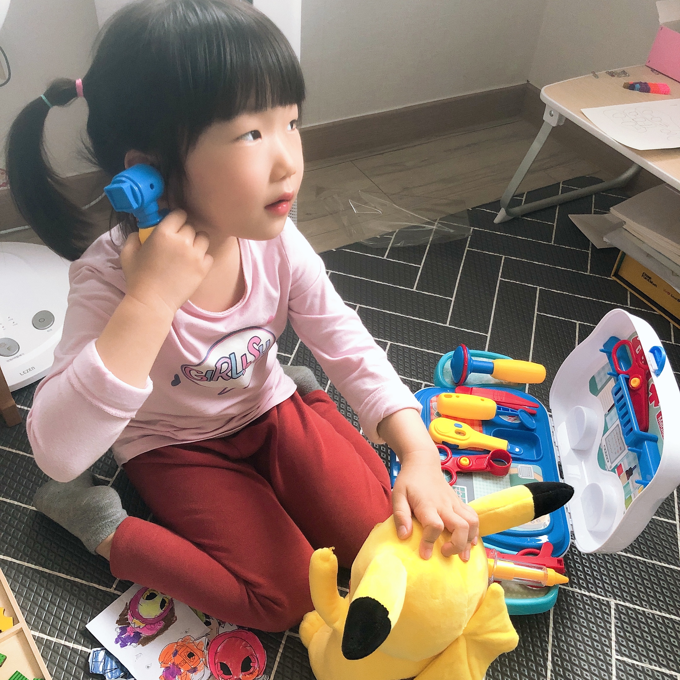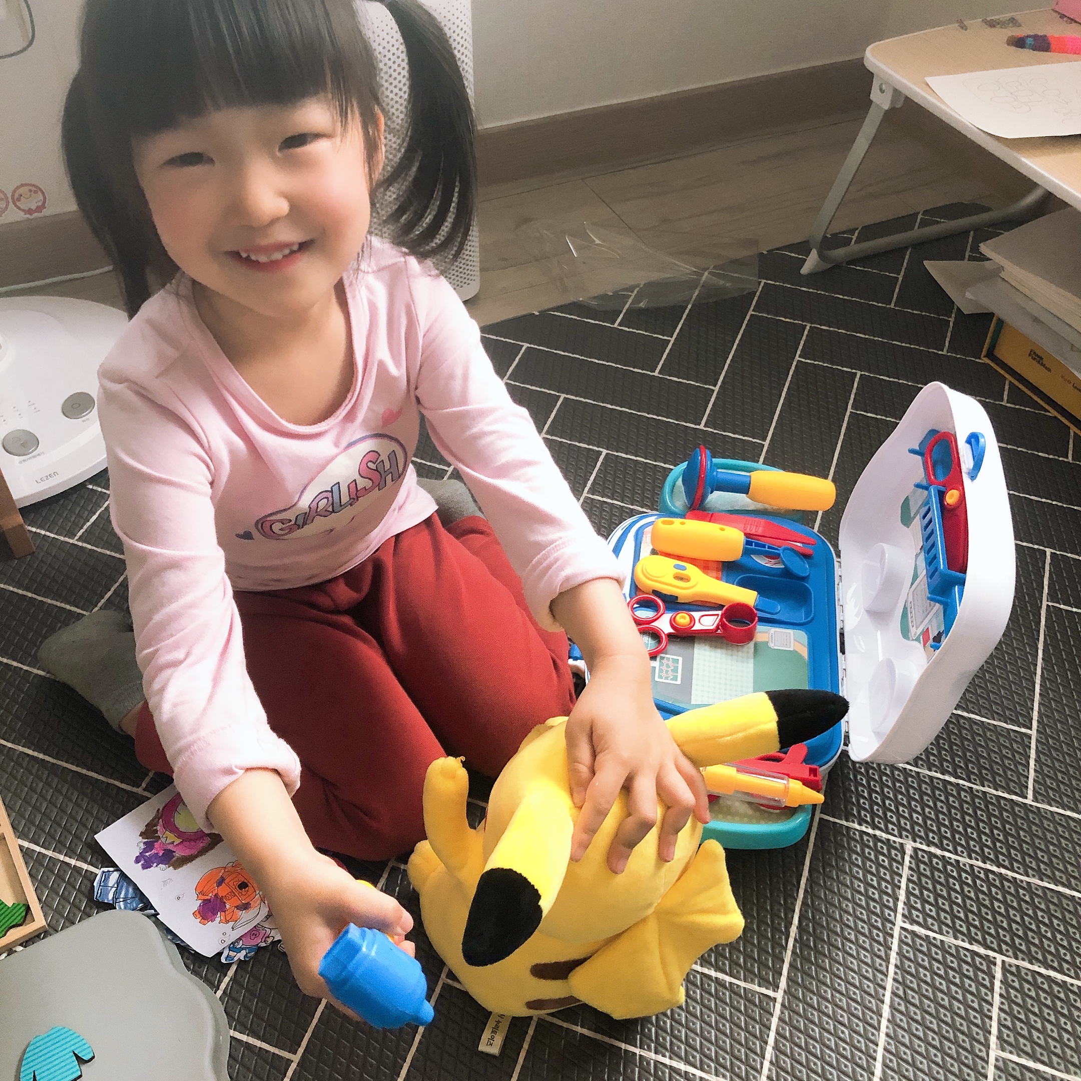 겁내는 피카츄를 위해 시범도 보여주고 야무지게 병원놀이를 하는 우리 소욤이 :) 병원놀이는 아마도 세대구분없이 이어져 오는 유아들이 역할놀이일 것이다. 우리 아이들은 6살, 7살이라서 조금 늦은감이 있는데 3~5살의 어린 유아들이라면 알찬 구성의 가성비 놀이키트 - 아가플러스 자동차가방 병원놀이를 추천한다.