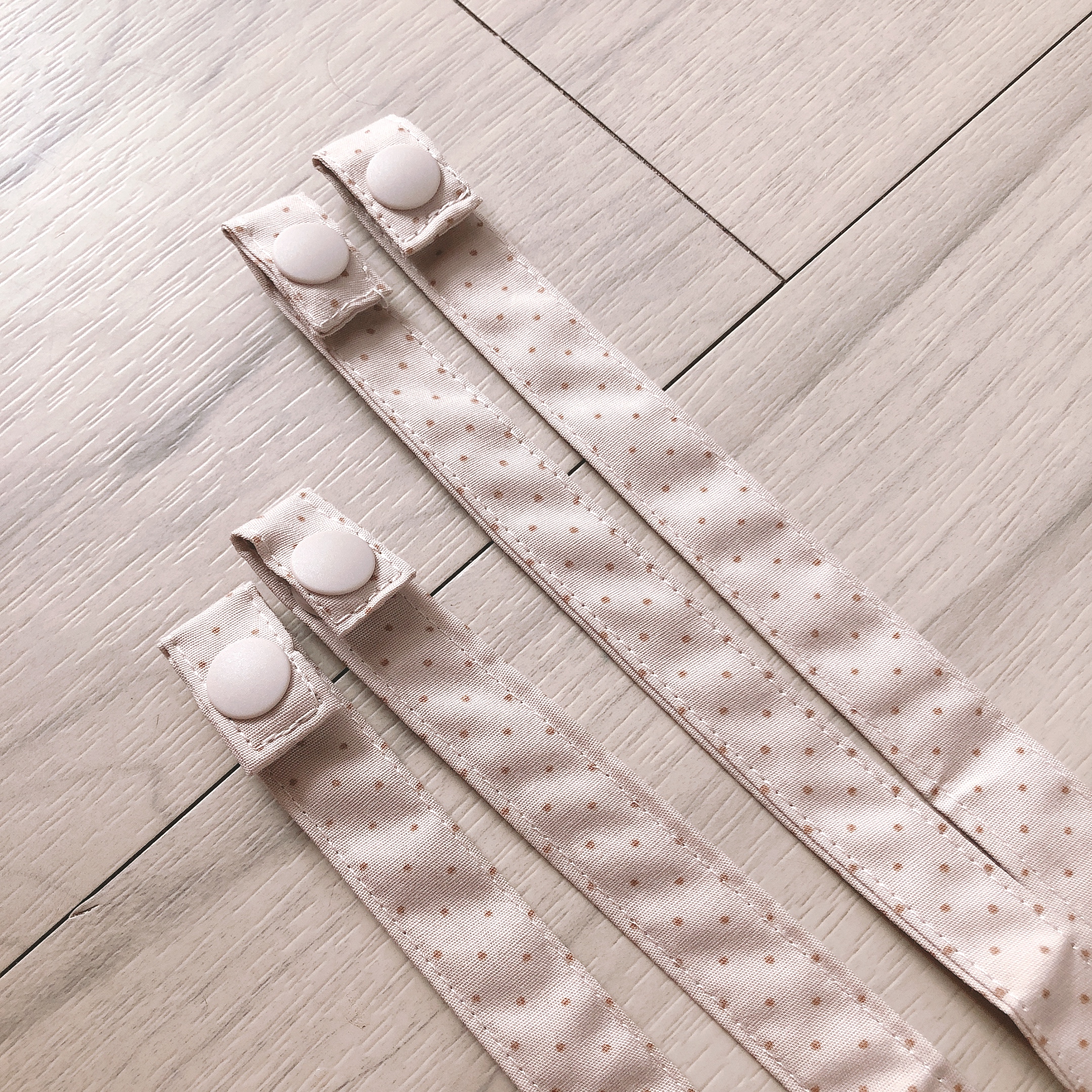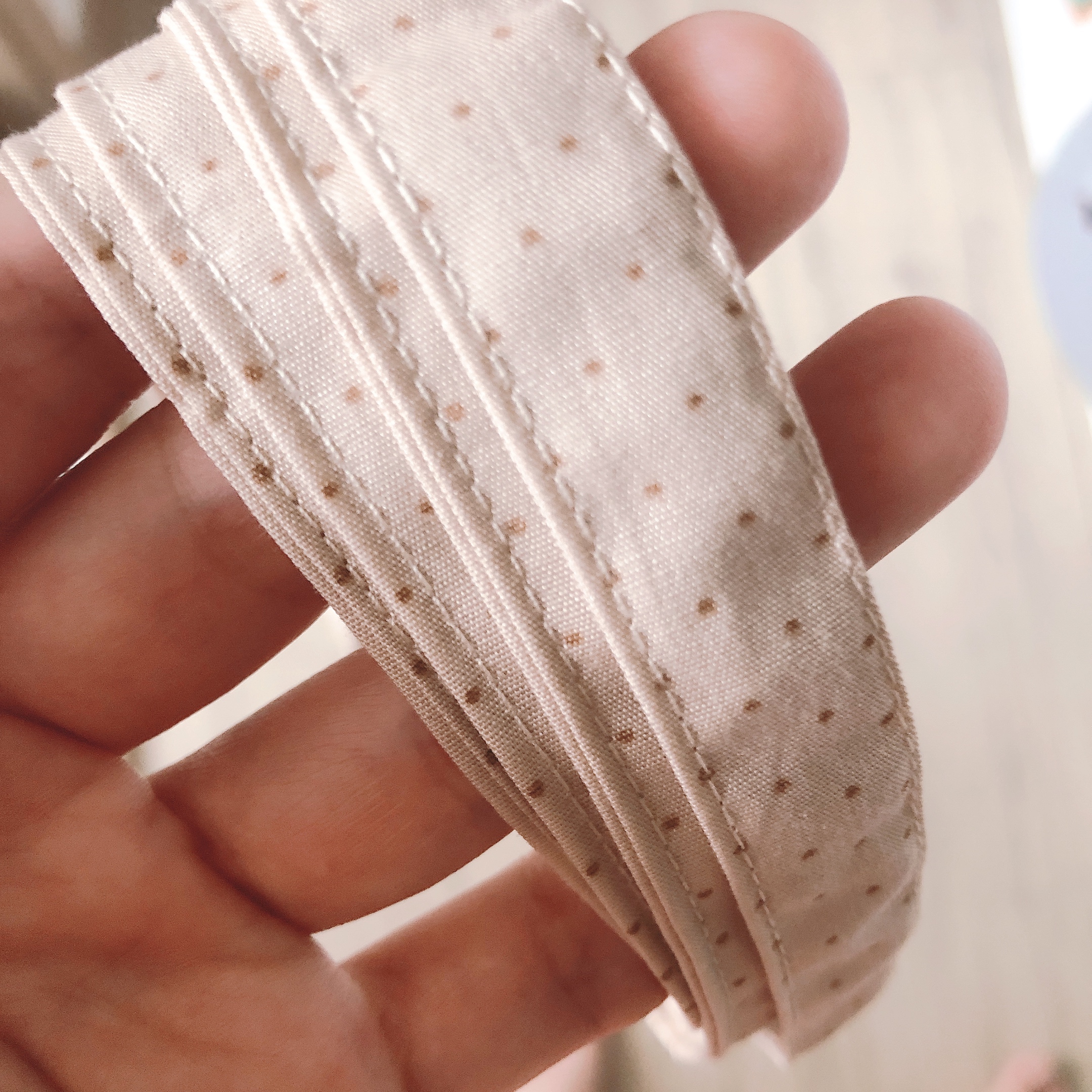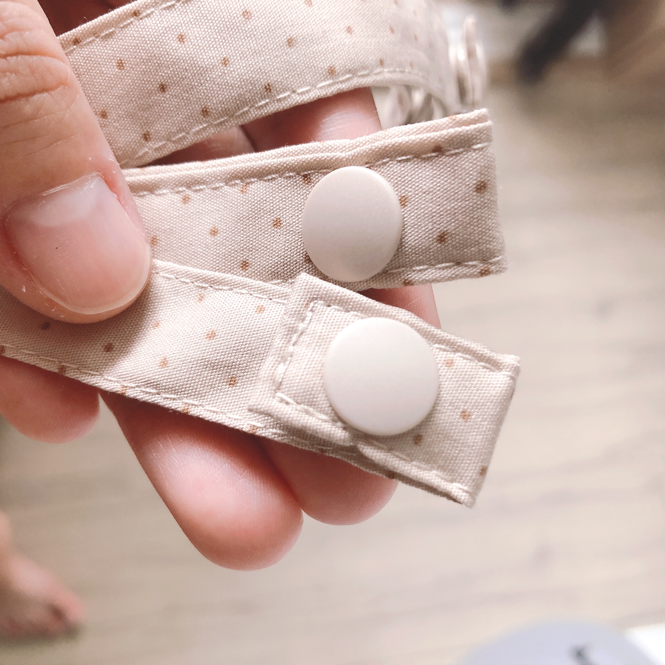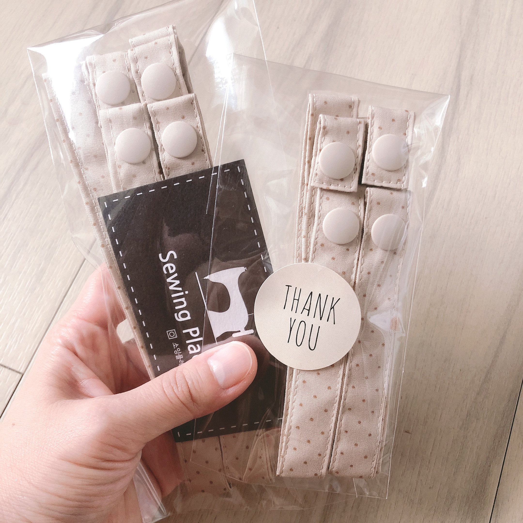 미싱공방 소잉플레이스 작가님이 핸드메이드로 제작한 천 마스크 스트랩인데, 여러가지 디자인과 사이즈를 선택할 수 있다. 내가 선택한 디자인은 차분한 느낌의 도트베이지~ 유아용/아동용/성인용 3가지 길이로 준비되어 있는데 하요미, 소요미와 모녀 커플스트랩으로 사용하려고 유아용도 함께 주문했다.