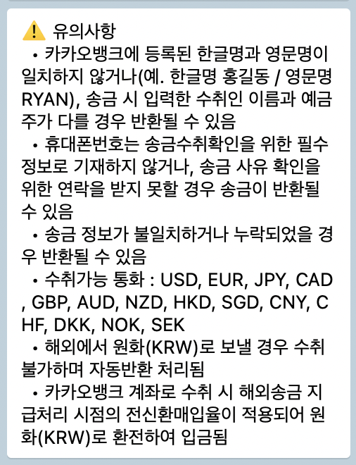 카카오뱅크에 등록된 한글명과 영문명이 일치하지 않거나 송금 시에 입력한 수취인 이름과 예금주가 다를 경우 반환될 수 있으니 주의하자. 수취 가능 통화는 USD, EUR, JPY, CAD, GBP, AUD, NZD, HKD, SGD, CNY, CHF, DKK, NOK, SEK 이며, 카카오뱅크 계좌로 수취 시 해외송금 지급처리 시점의 전신환매입율이 적용되어 원화(KRW)로 환전하여 입금되는 점도 참고하면 좋을 것 같다.