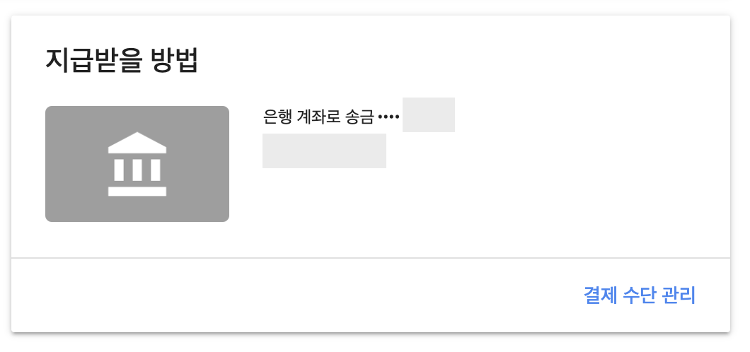우연히 애드센스 사이트의 지급 카테고리에 들어갔는데 새로운 카드가 생긴 것을 발견했다. 수익을 지급받으려면 결제수단을 추가하라는 내용의 카드였다. (아마도 수익금액 10달러가 넘어서 새로 생긴것으로 추정)