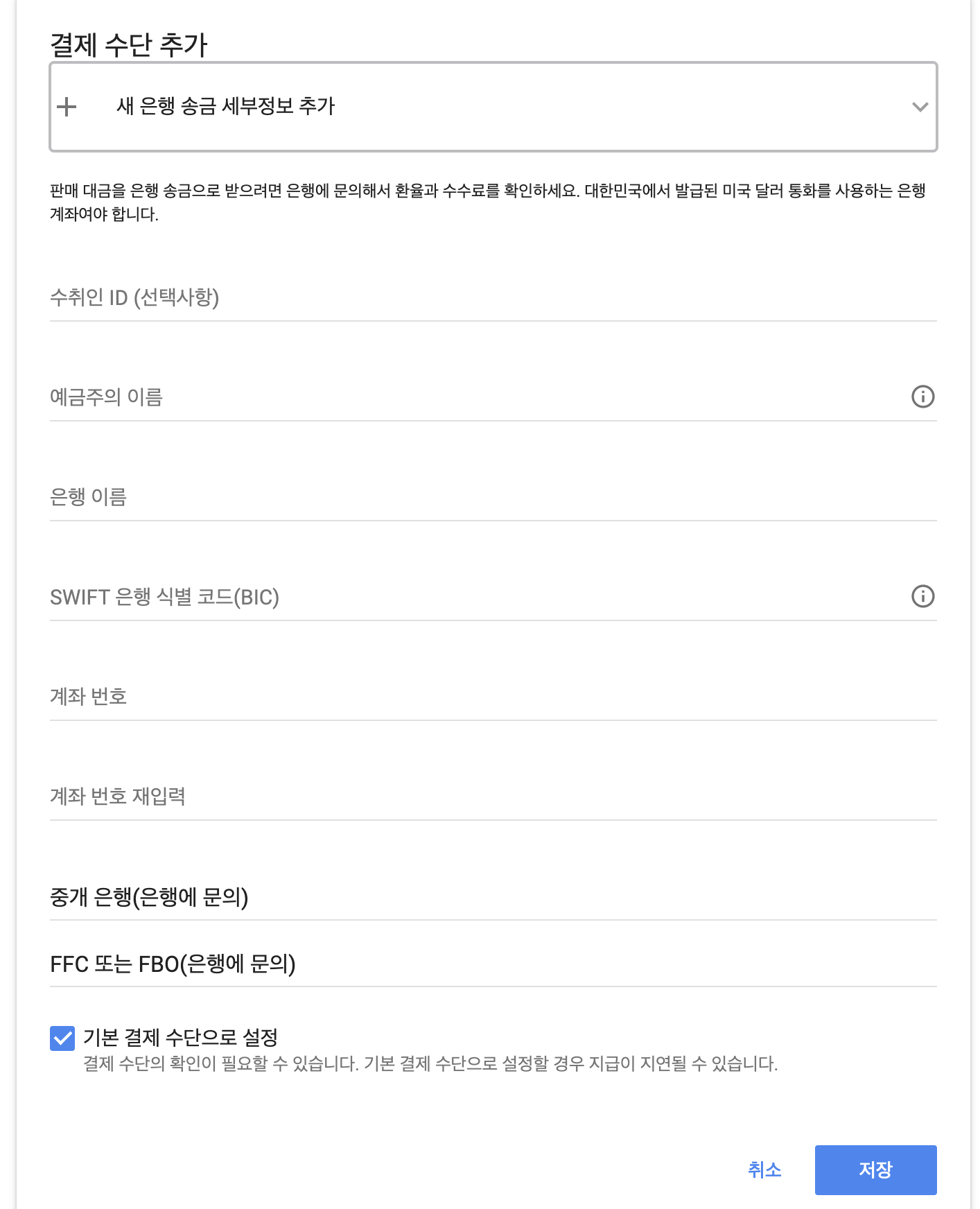 이런 것들은 발견하자마자 바로 해 두는 것이 마음 편하다. 우측 하단의 결제 수단 추가를 클릭했다. 결제 수단 추가로 새 은행 송금 세부정보 추가 or 새 수표 세부정보 추가 둘 중의 하나를 선택하게 되어 있다. 새 수표는 뭔지 모르겠고 나는 은행 계좌를 이용할 예정이기 때문에 새 은행 송금 세부정보 추가를 선택했다.