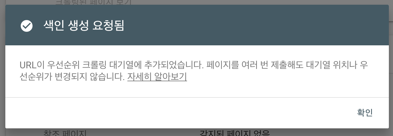 색인 생성이 완료되었다. URL이 우선순위 크롤링 대기열에 추가되었다고 한다. 요청하자마자 문제가 바로 짠 하고 해결되지는 않지만, 그냥 기다리는 것보다는 빠른 처리가 가능할 것이다.