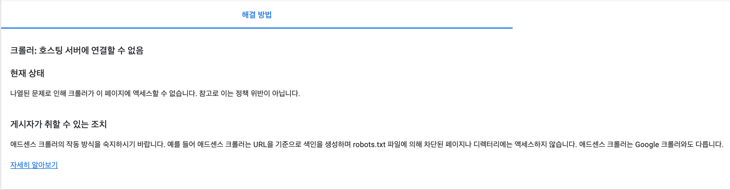 크롤러 오류 문제는 정책 위반이 아니라고 하며, 애드센스 크롤러의 작동 방식을 숙지하라고 한다. 자세히 알아보기 버튼을 누르면 원인으로 추측되는 여러가지 항목들을 확인할 수 있다.