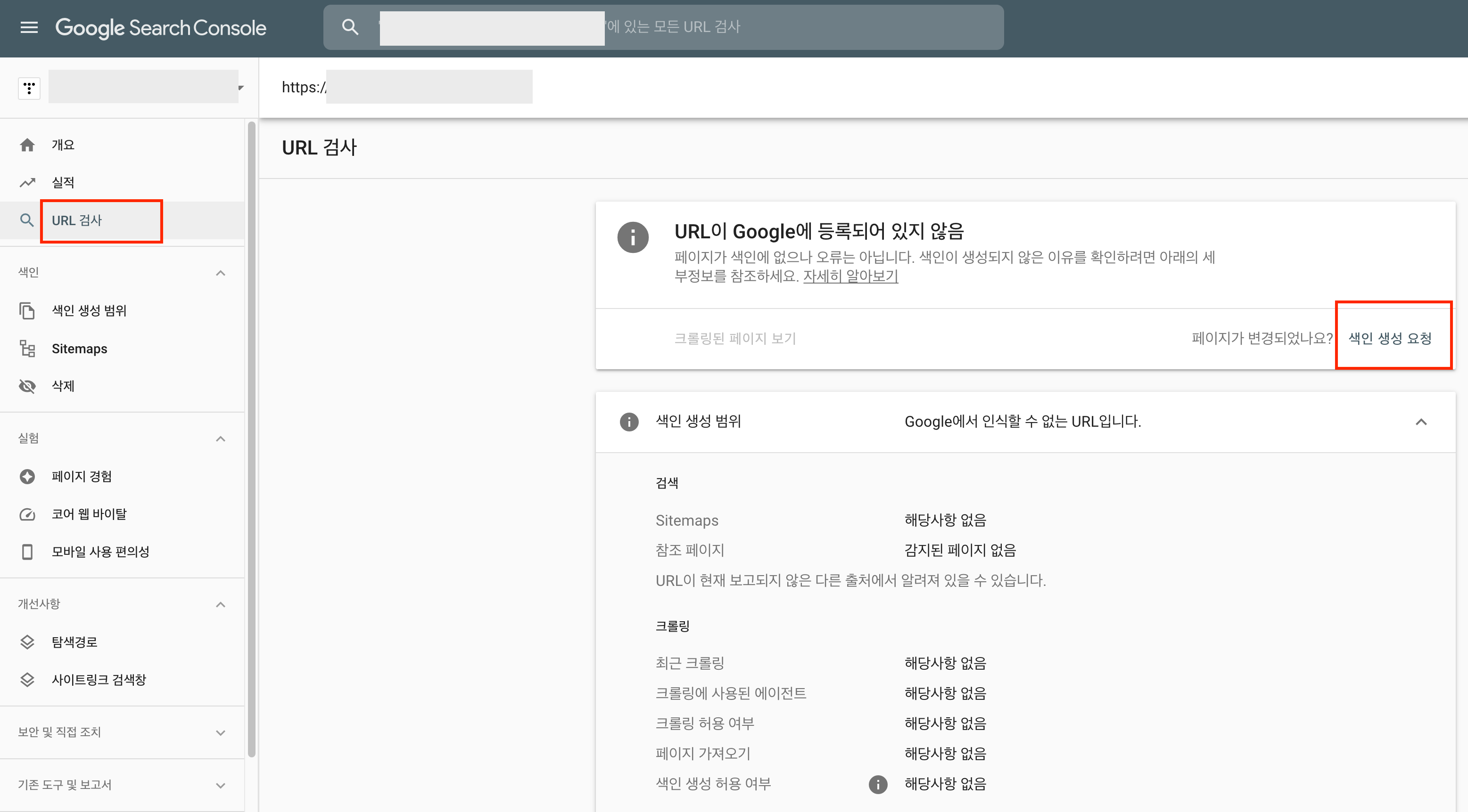 만약 이 문제를 더 빨리 해결하고 싶다면 구글 서치 콘솔에서 URL 검사를 통해 색인 생성 요청을 하면 된다. 구글 서치 콘솔(Google Search Console) 좌측 메뉴바에서 URL 검사를 클릭하고, 상단 검색바에 문제가 있는 링크 주소를 입력한 후에 검색한다. URL이 구글에 등록되어 있지 않다는 메세지가 뜨는데 '색인 생성 요청'을 누르면 된다.