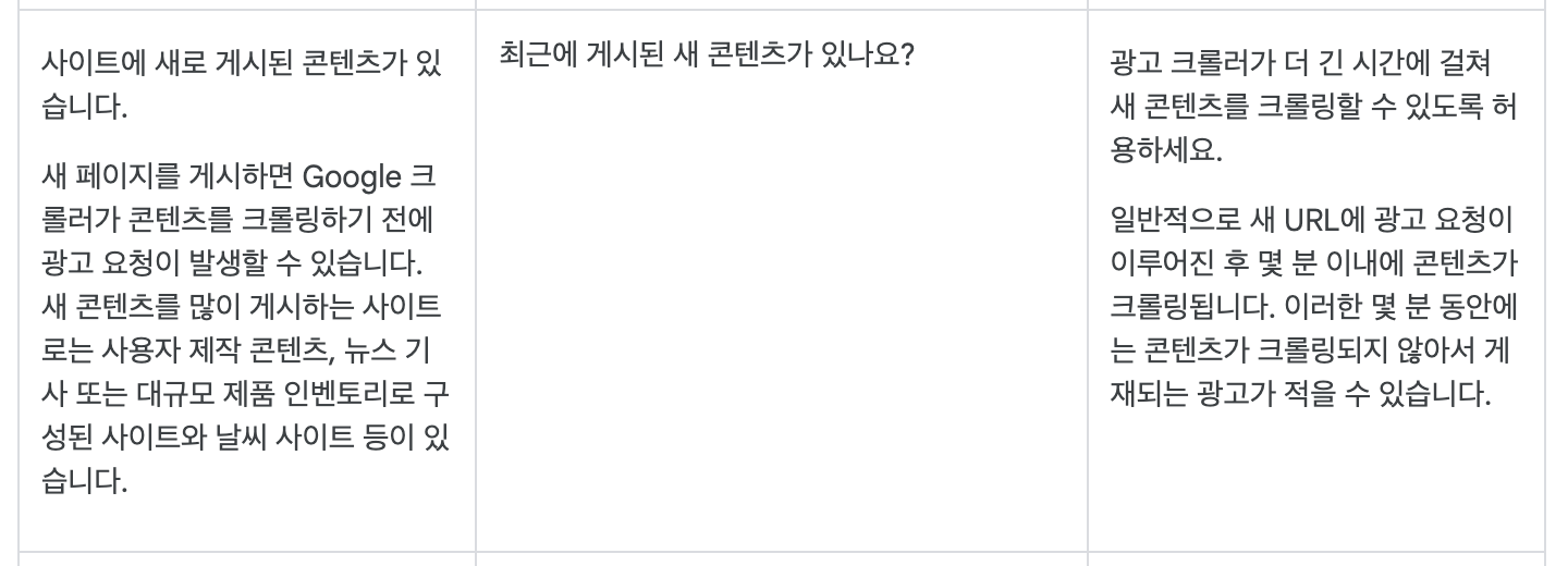 내가 생각하는 가장 유력한 원인은 위와 같다. 사이트에 콘텐츠를 새로 게시하면 구글 크롤러가 콘텐츠를 크롤링하기도 전에 광고 요청이 발생할 수 있는데, 이 타이밍이 맞지 않아서 오류가 생기는 것이다.