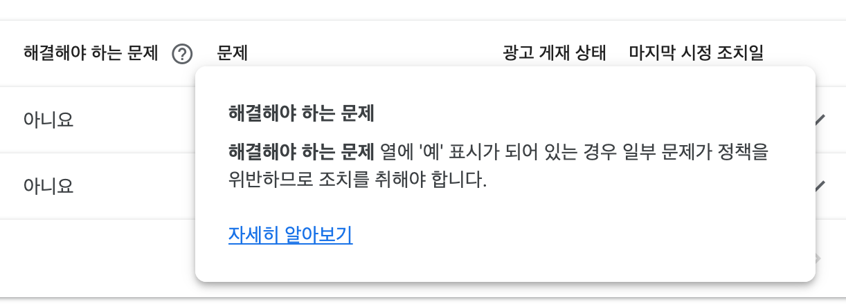 해결해야 하는 문제에 '아니오'라고 되어 있다. 이 부분이 '예'로 되어 있는 경우, 일부 문제가 정책을 위반하고 있다는 의미이므로 적절한 조치를 취해야 한다.