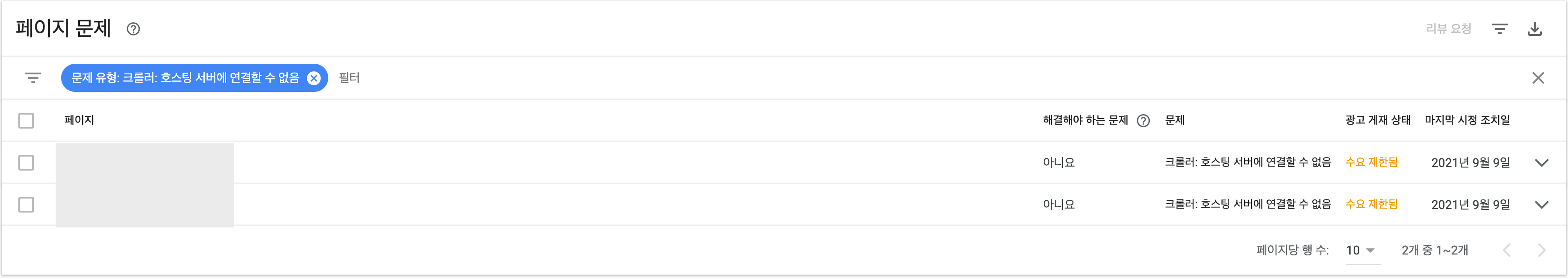 광고 크롤러 오류 안내 메세지 우측의 '작업'을 클릭하여 좀 더 자세히 살펴보기로 했다.