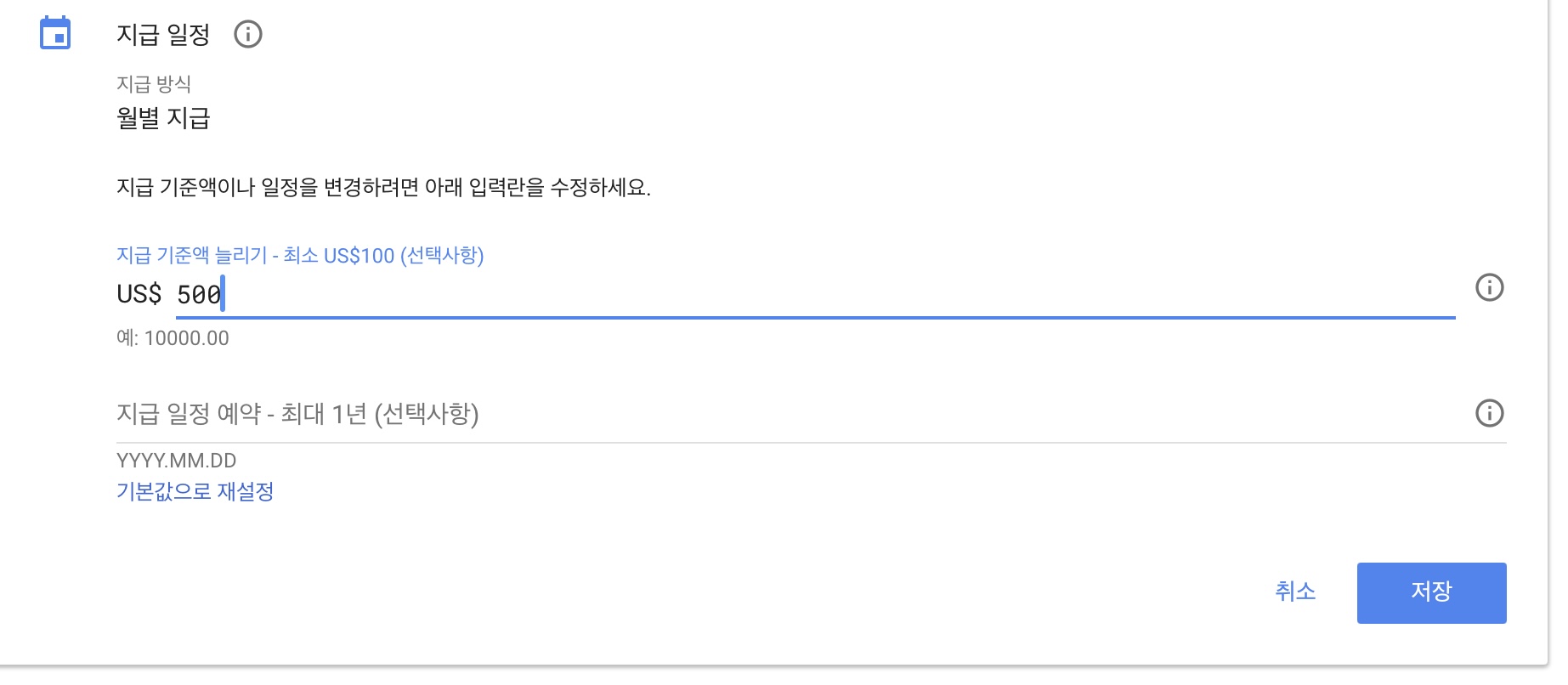 저장을 하고 나면 결제계정에서 청구 기준액이 US$500으로 바뀐 것을 확인할 수 있다.