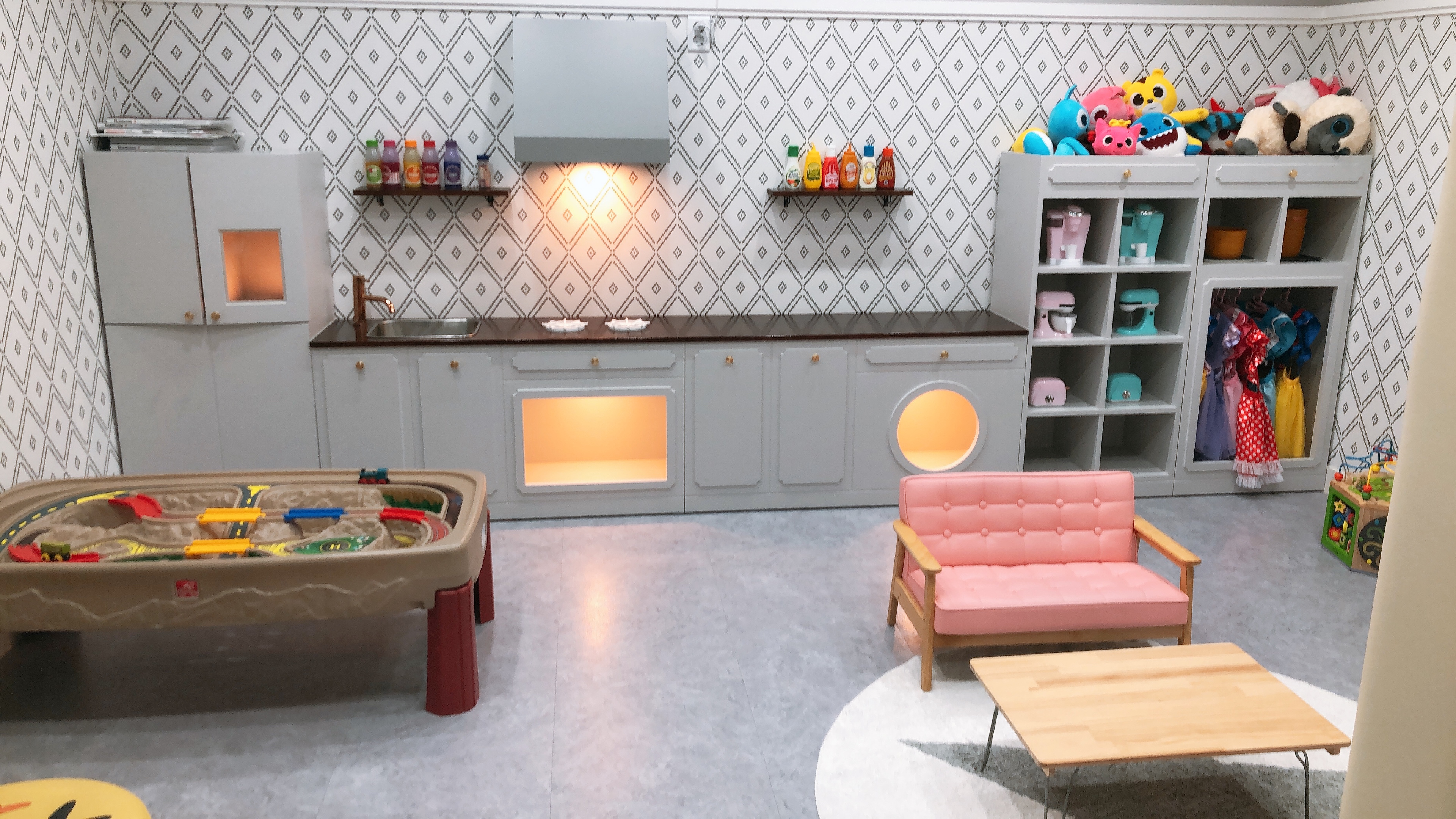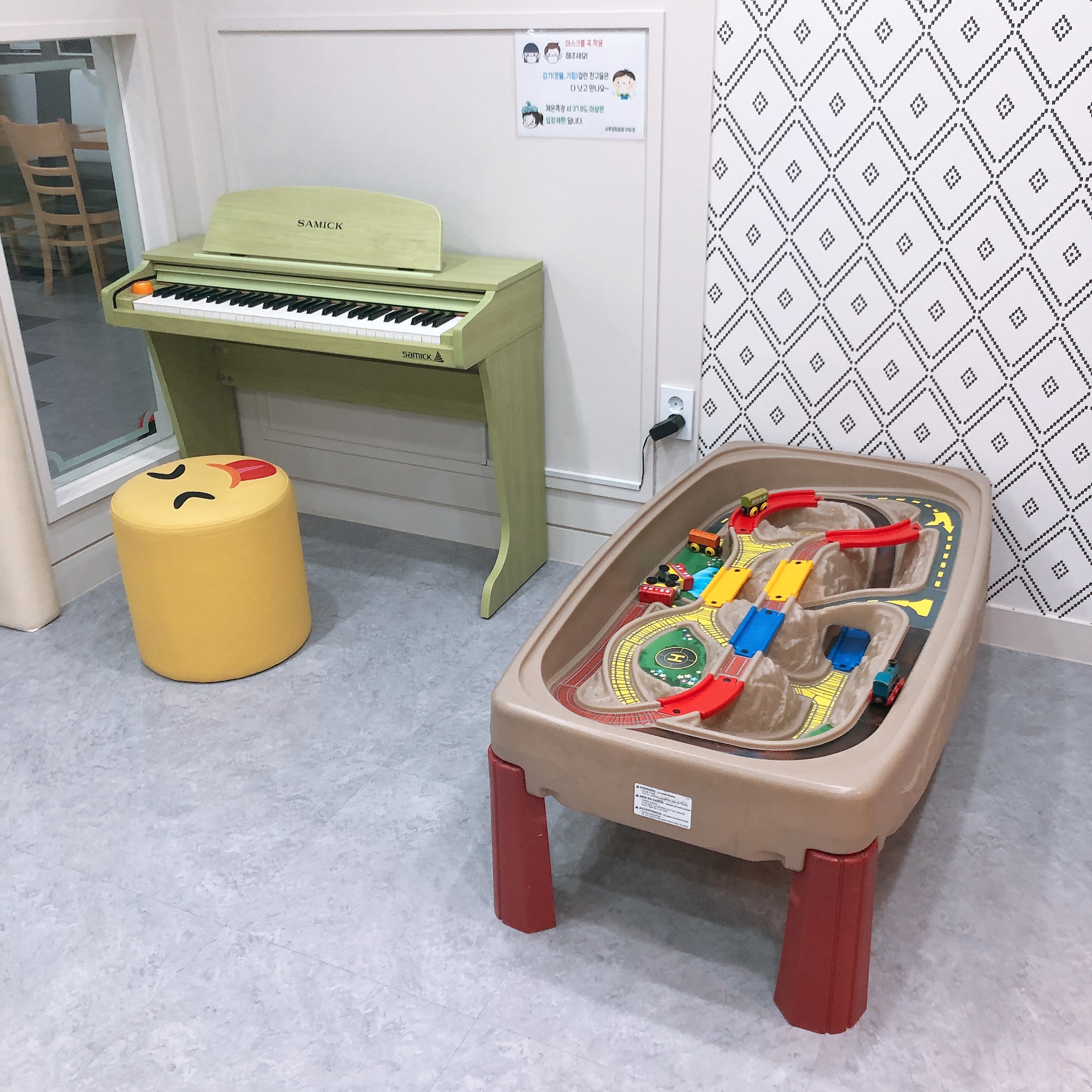 넘나 아늑하고 예쁜 주방이다. 주방 옆에는 피아노와 자동차 놀이를 할 수 있는 트랙도 놓여져 있다. 주방을 보고 감탄한 부분은 모든 물건들이 정말 청결하고 가지런히 정돈되어 있다는 점이다. 각종 주방가전 놀이기구들이 버튼을 누르면 작동을 하고 (맨날 고장난 것만 보다가 고장 안난 걸 보고 당황...ㅋㅋㅋ) 채소, 야채, 과일, 그릇, 수저 등이 모두 제자리에 정리되어 있다.