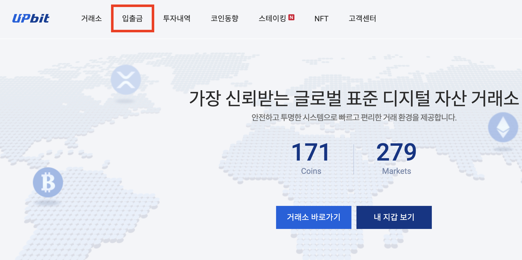 업비트 첫 페이지 > 상단 메뉴 중에서 '입출금'을 선택한다.
