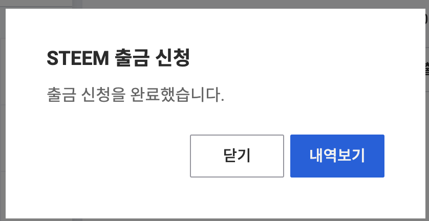 스팀(STEEM) 출금 신청이 완료되었다는 팝업창이 뜬다.