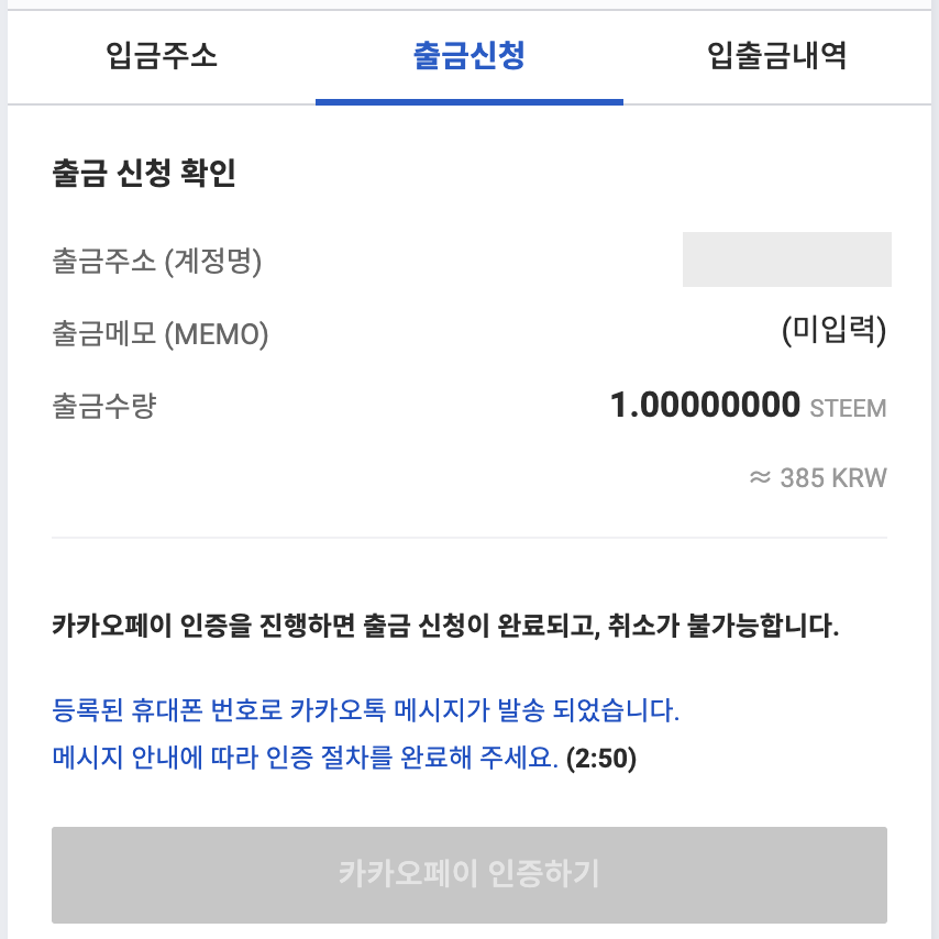 마지막으로 카카오페이 인증을 진행하여 최종적으로 출금 신청을 한다.