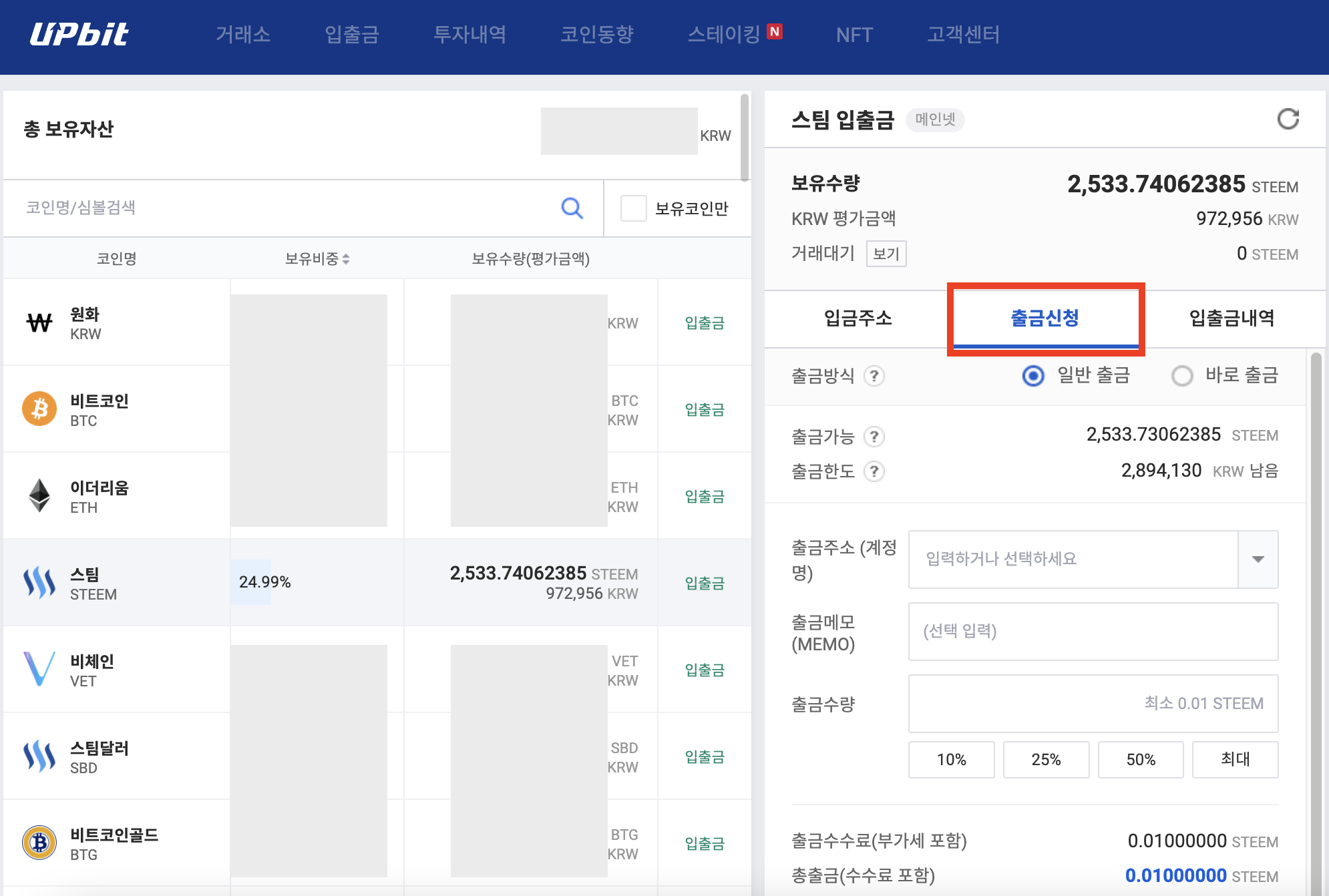 입출금 페이지에서 총 보유자산 목록을 확인할 수 있는데 이 중에서 스팀을 선택하면, 우측에 스팀 입출금이 가능한 화면이 보인다. 입금주소, 출금신청, 입출금내역을 각각 확인할 수 있는 탭으로 나뉘어져 있다. 두번째 '출금신청'을 클릭한다.