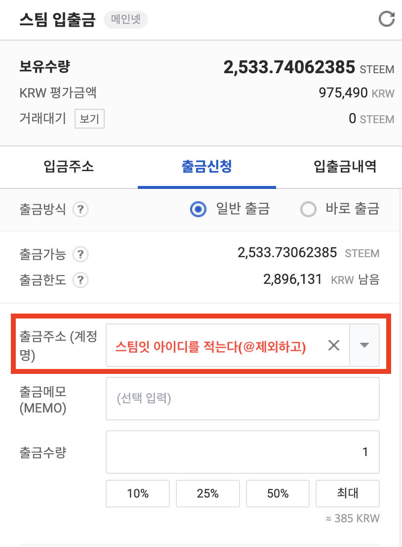 업비트에서 스팀잇으로 스팀을 보낼때는 출금주소에 스팀잇 아이디만 적으면 된다. 예를 들어 스팀잇 아이디가 @steemlove12 라면 @를 제외한 steemlove12 를 적어주면 된다. 출금메모는 선택입력 사항이다.