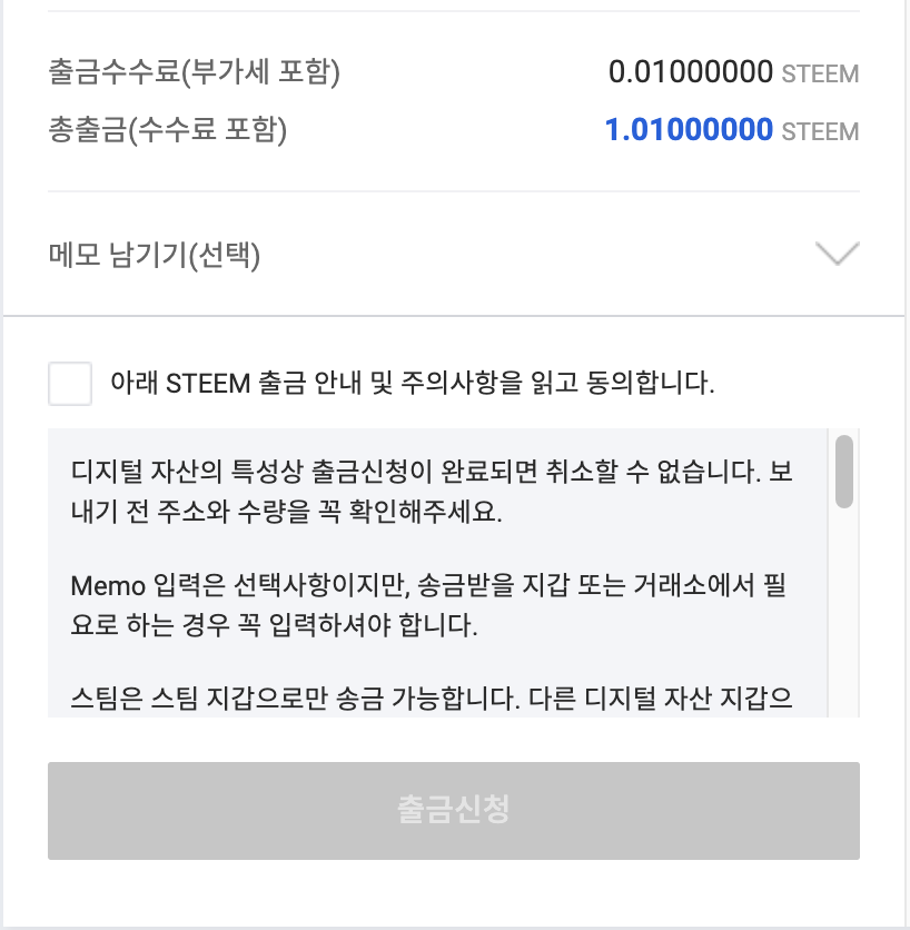 출금수량을 입력하면 아래에서 출금 수수료(부가세 포함)를 포함한 총 출금액을 확인할 수 있다. 주의사항 동의 체크를 하고 출금신청 버튼을 누른다.