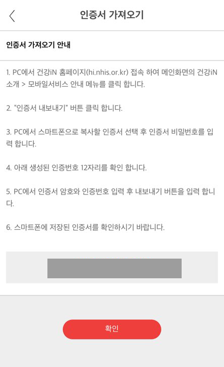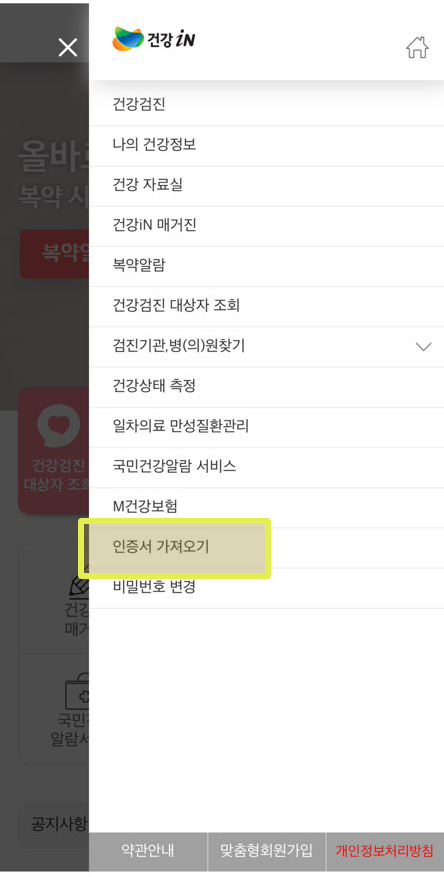 공인인증서를 선택한 뒤 인증서 암호는 우리가 알고 있는 그것(?)을 입력하면 되고, 인증번호는 아까 다운로드한 건강in 앱에서 받아야 한다. 다시 앱으로 이동해 보자.