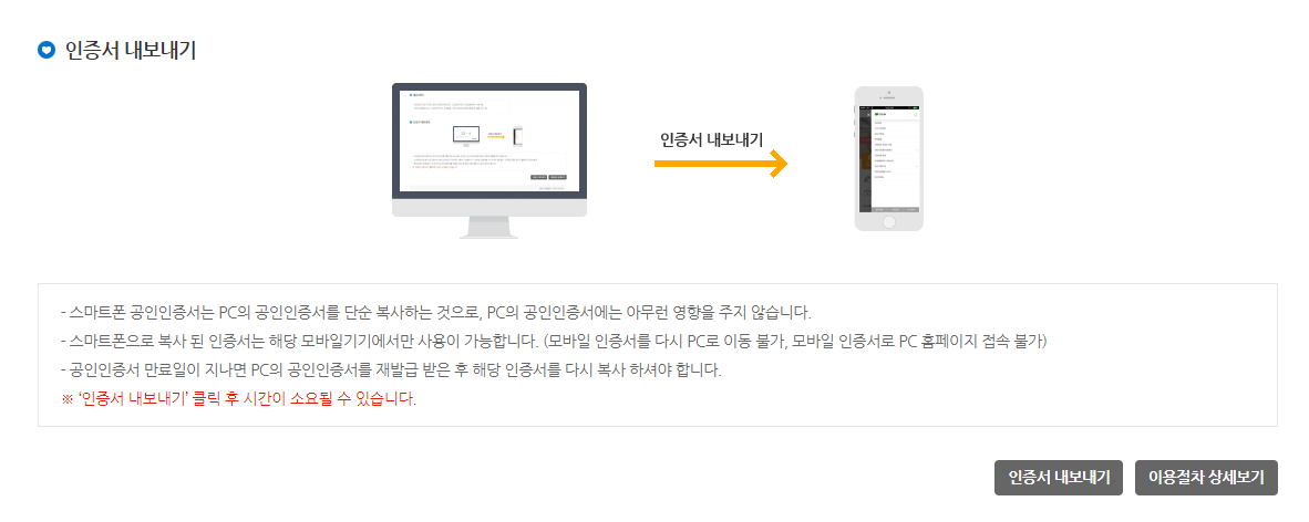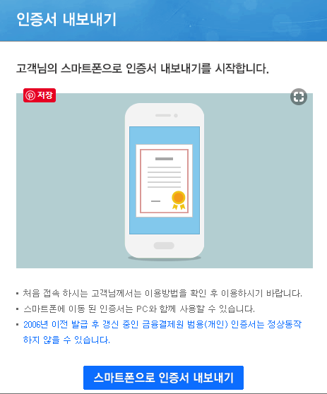 설치를 마치고 나면 아래와 같은 인증서 내보내기 안내 팝업창이 뜬다. 스마트폰으로 인증서 내보내기 버튼을 다시 클릭하면 인증서 암호와 인증번호를 입력하는 새로운 창을 볼 수 있다.