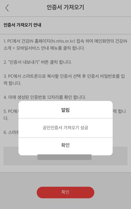 앱을 실행한 후 우측 상단 카테고리 아이콘을 클릭하여 '인증서 가져오기' 항목을 선택한다. 페이지에서 생성된 인증번호 12자리를 확인한 후에 PC의 인증번호 항목에 입력하고 '내보내기' 버튼을 클릭하면, 모바일에서도 자동으로 공인인증서 가져오기 성공이라는 알림창이 뜬다.