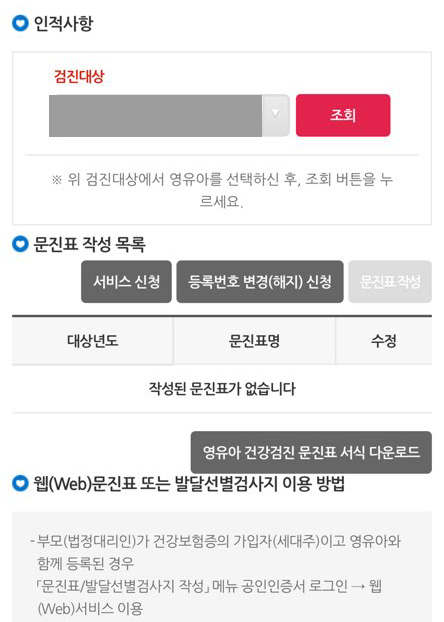 로그인이 완료되면 문진표/발달선별 검사지 작성 페이지로 이동한다. 아랫부분으로 스크롤을 내려서 검진대상을 선택하고 조회하면, 아직까지 작성했던 문진표 목록을 확인할 수 있다. 이미 작성한 문진표를 수정하는 것이 아니라면 리스트 바로 위에 있는 '문진표 작성' 버튼을 클릭하여 해당 개월수에 맞는 문진표를 작성한다. (참고로 영유아 건강검진을 하려면 문진표와 발달선별검사지를 모두 작성, 제출해야 한다)